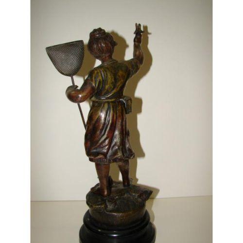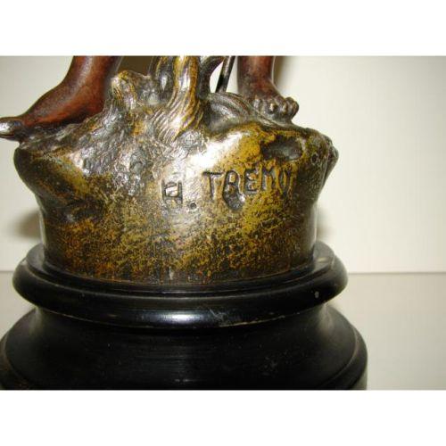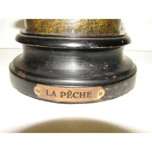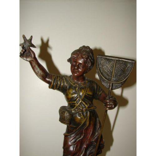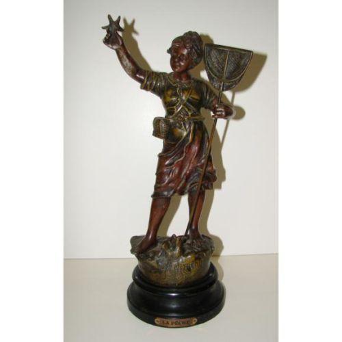 BRONZED SPELTER STATUE ON WOODEN BASE. Titled “LA PECHE” on brass tag on wooden base. Depicts a woman holding a fish net in left hand and a starfish in right hand. Statue is signed at bottom “Tremo”. 15.25” H