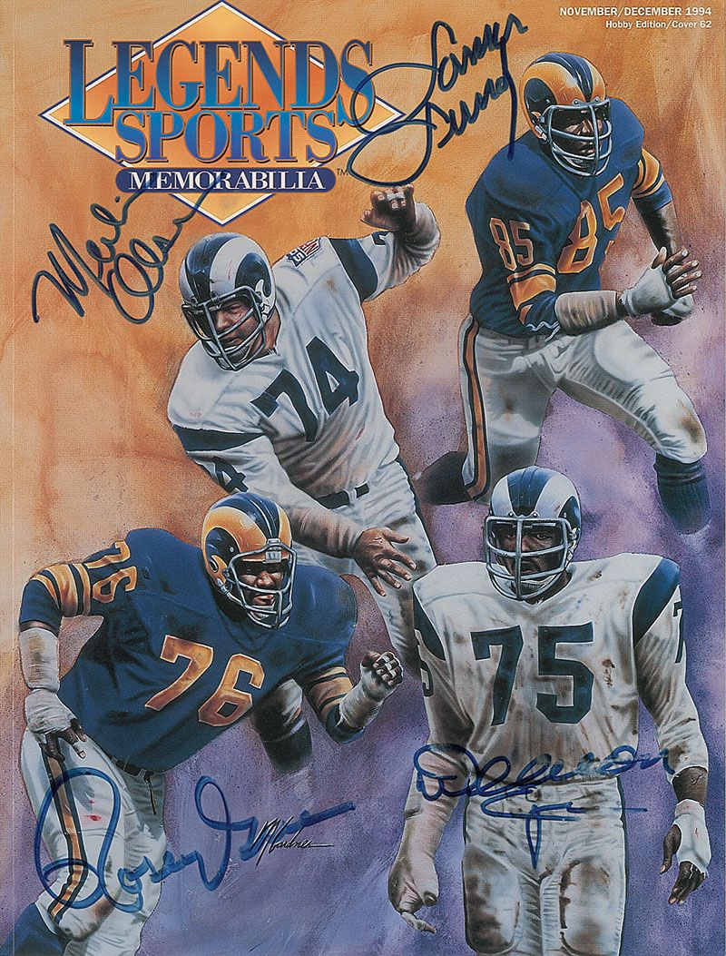 Legends Sports Memorabilia magazine, dated November/December 1994, featuring the members on the front cover, signed on the front cover in blue felt tip by Lamar Lundy, Rosey Grier, Merlin Olsen, and Deacon Jones. In fine condition, with a light brush to Jones’s signature.