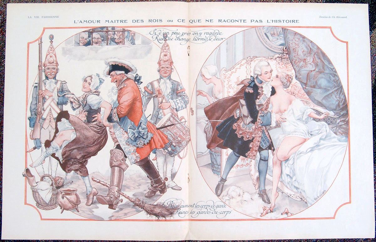 This a vintage 1926 Art Deco French centerfold print from the erotic French magazine La Vie Parisienne. Titled L'Amour Maitre des Rois ou Ce Que Ne Raconte Pas L'Histoire. This is a quality internal color centerfold illustration with images or text on the reverse. Illustrated by Cheri Herouard. SIZE: Approx. 21" x 13 1/2". La Vie Parisienne was a French weekly magazine founded in Paris in 1863 and popular at the start of the 20th century. Originally it covered novels, sports, theater, music and the arts. In 1905 the magazine changed hands and the new editor Charles Saglio changed its format to suit the modern reader. It soon evolved into a mildly risque erotic publication. During World War I, General Pershing personally warned American servicemen against purchasing the magazine, which boosted its popularity in the United States. La Vie Parisienne was hugely successful because it combined a new mix of subjects - short stories, veiled gossip and fashion banter, also comments about subjects from love and the arts to the stock exchange - with beautiful cartoons and full-page color illustrations by leading artists of the age. Alongside this the magazine also reflected the changing interests and values of the start of the 20th century population such as fashion and frivolity. The artwork of La Vie Parisienne reflected the stylization of Art Nouveau and Art Deco illustration, mirroring the aesthetic of the age as well as the values, and this coupled with the intellectualism, wit and satire of its written contributions was a combination that proved irresistible to the French public. It included artwork of illustrators including George Barbier, Cheri Herouard, Georges Leonnec, and Maurice Milliere.