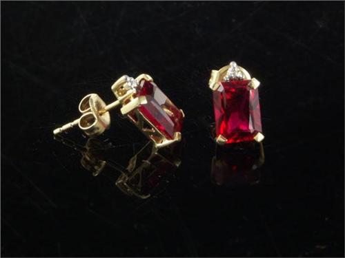 EARRINGS: Pair of classic emerald cut lab-created ruby and diamond earrings set in 10K yellow gold. Medium red rubies measure approximately 2.00 ctw and are transparent. Single cut diamonds measure approximately 0.02 ctw, have SI2 to I1 clarity and I to J color. Appraisal included.