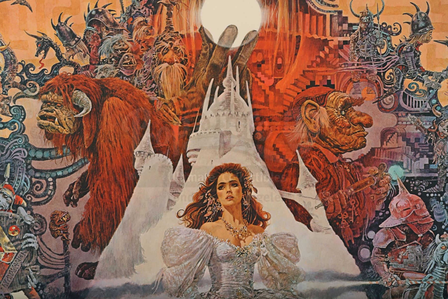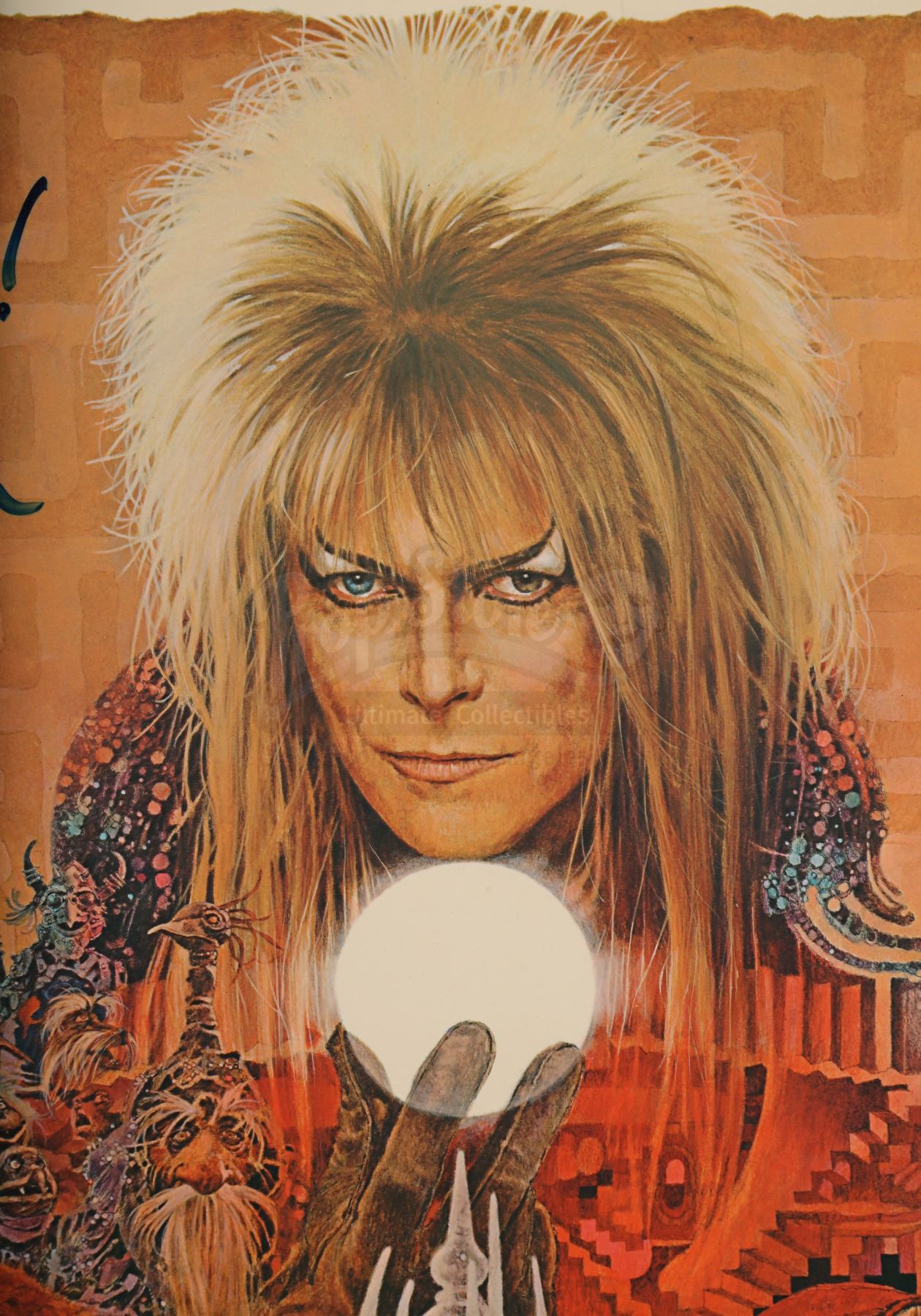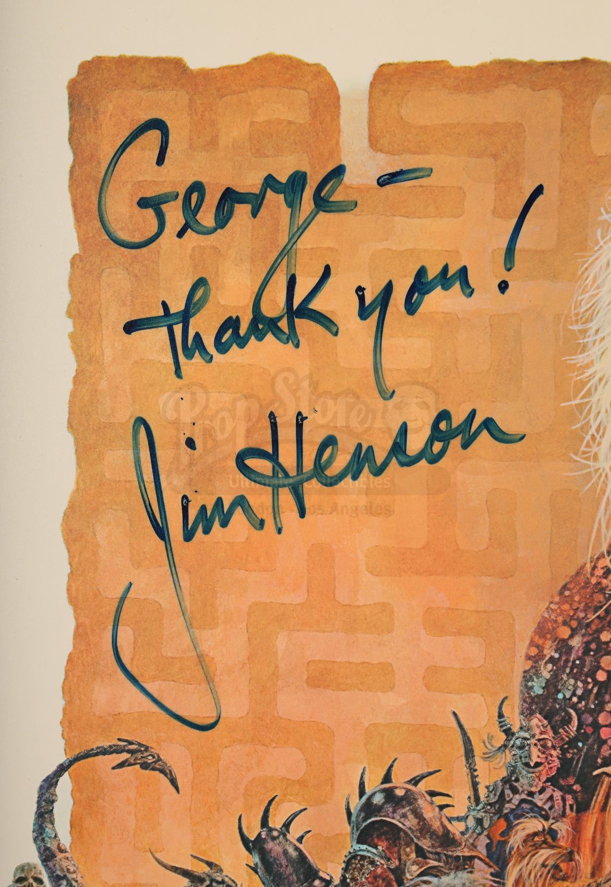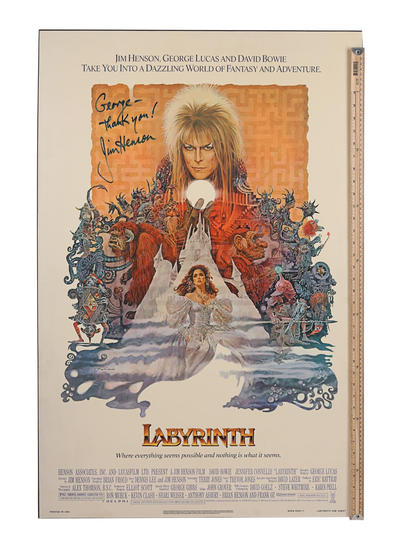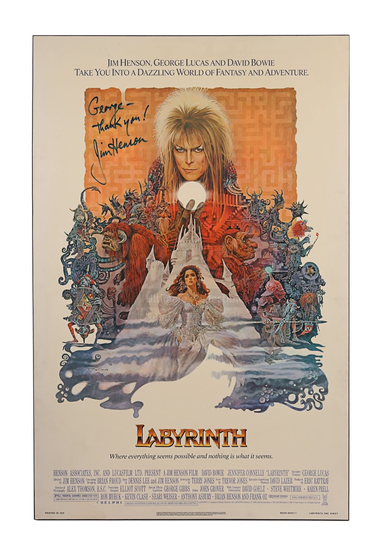 An autographed poster from the promotion of Jim Henson's fantasy film Labyrinth. Illustrated by Ted De Conis, this US one-sheet depicts Goblin King Jareth (David Bowie) holding one of his crystal balls; Sarah (Jennifer Connelly) dressed in her ball gown; and an array of puppets from the film. The poster has been permanently mounted to board and the top left corner features Henson's autograph in blue marker, with an inscription reading "George - Thank you!" Some of the ink has faded slightly over time, minor wear is present around the edges of the panel, and the bottom right corner of the plastic film has begun to peel away. Dimensions: 93 cm x 68.5 cm x 1.5 cm (36 1/2" x 27" x 1/2")
