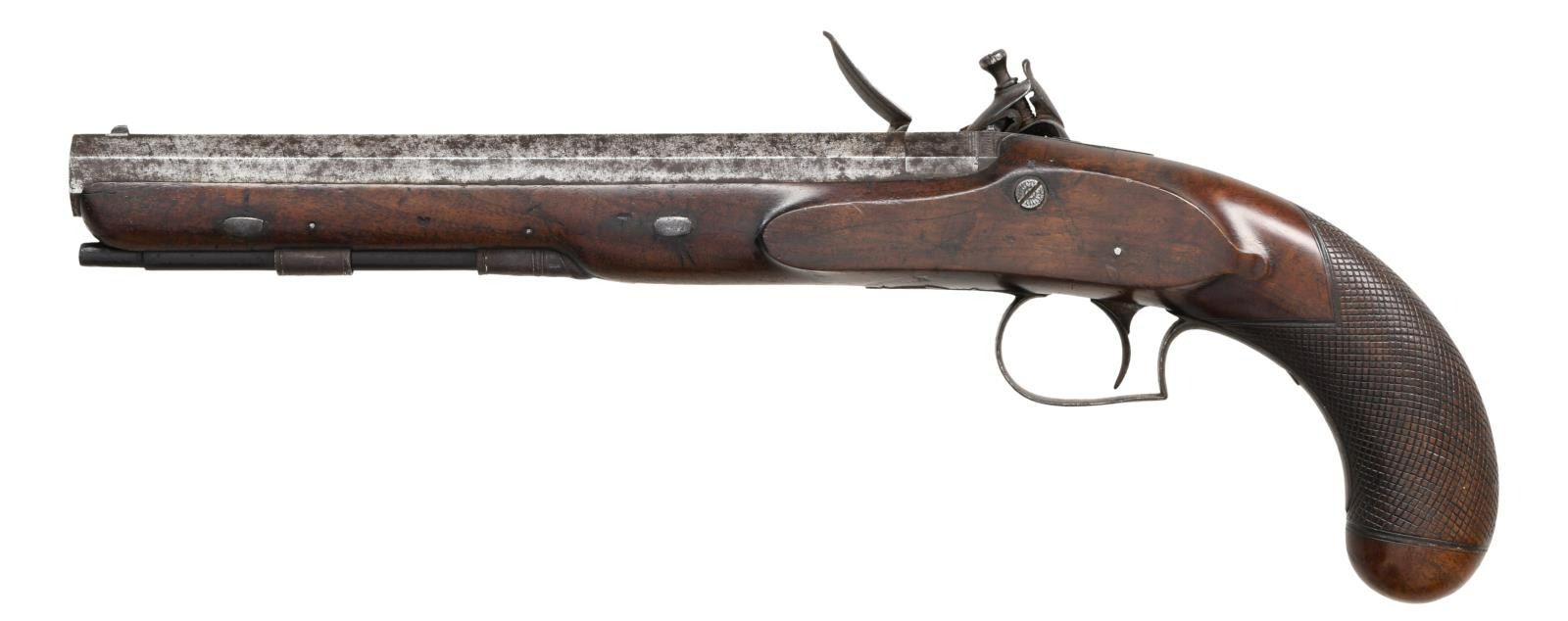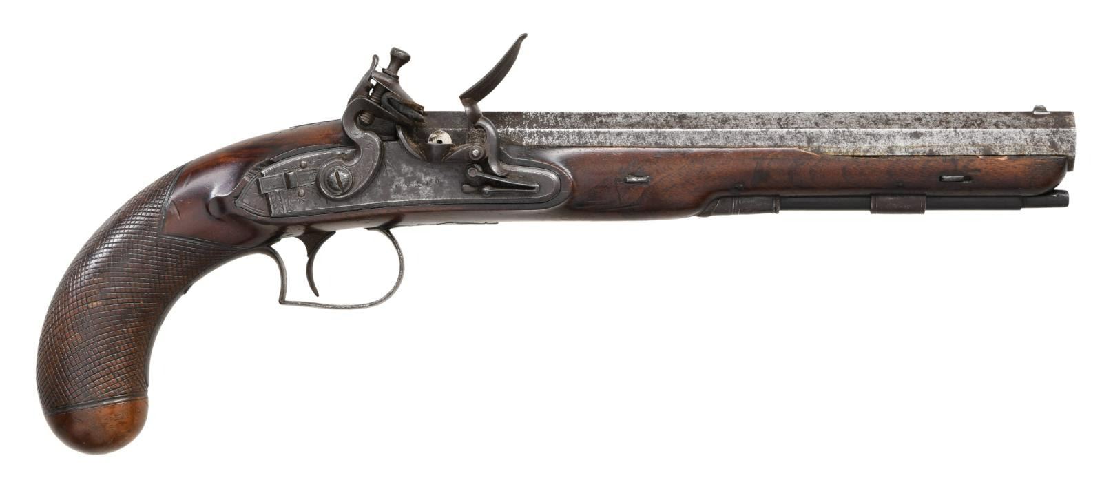 Cal. 52. NSN. Bbl. 9" oct. Small blade front sight. Fixed rear sight. Pistol appears to be a reconversion to flint. Lock marked "LACY & CO.". Bbl. marked "LACY & CO. LONDON". No other visible markings. Lock, upper tang, hammer & bottom metal have floral engraving. Checkered hardwood stock w/ two key escutcheons Hardwood replacement ramrod. CONDITION: right side of stock has a large chip at front, a couple other small chips, a few small cracks, scattered dings & handling wear. Metal is a dull gray patina w/ scattered oxidation & pitting. Oxidized & pitted bore. (01-24082/MJC). ANTIQUE. $1000-1500.