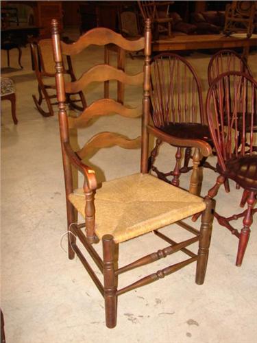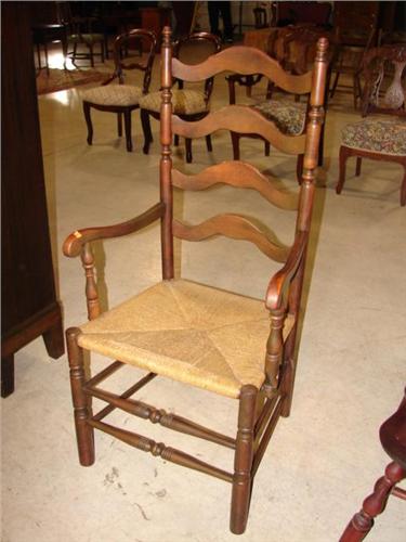 MAHOGANY LADDER BACK ARM CHAIR WITH RUSH BOTTOM SEAT. Has tear at seat. Four slat back. 46" H to top of back.