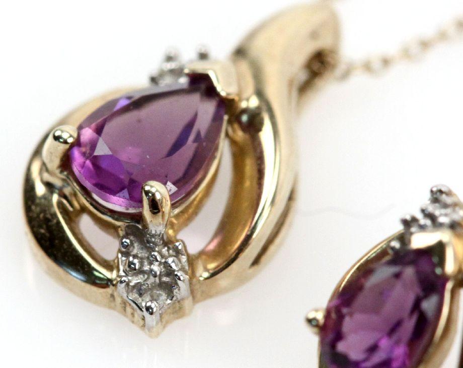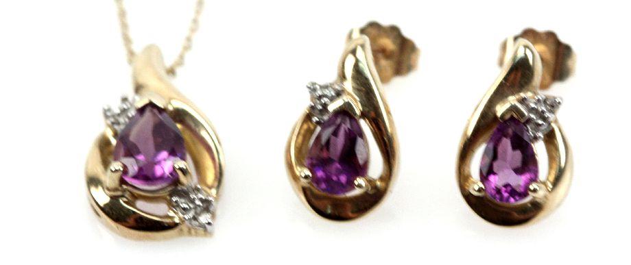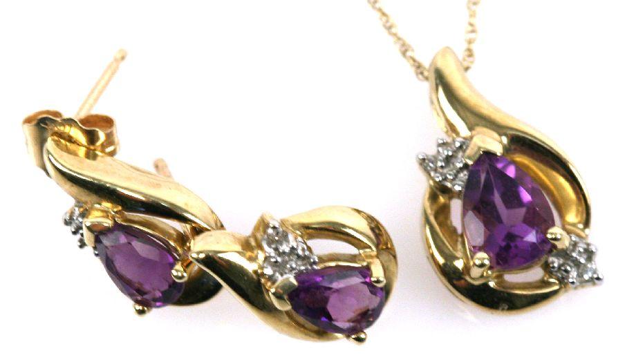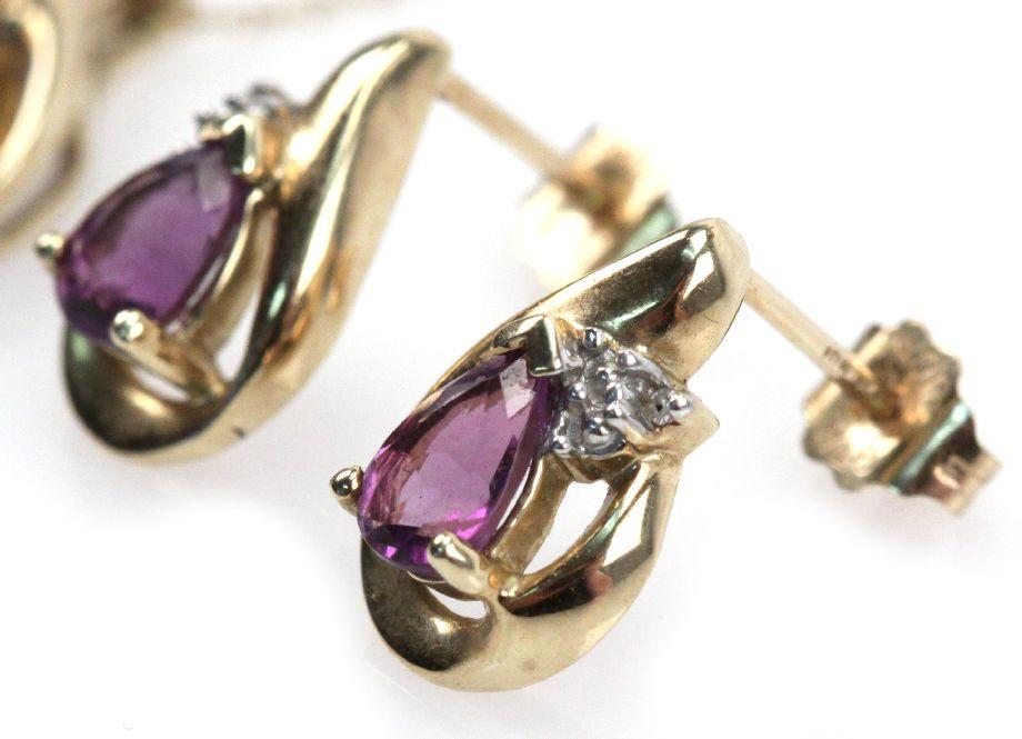 10K yellow gold jewelry set with an 18 inch rope chain necklace with an approx. 0.5 pear cut amethyst and round cut diamond accents and a matching pair of post-back amethyst and diamond earrings. Weight: 3.6 g Condition: Very good