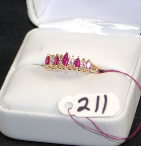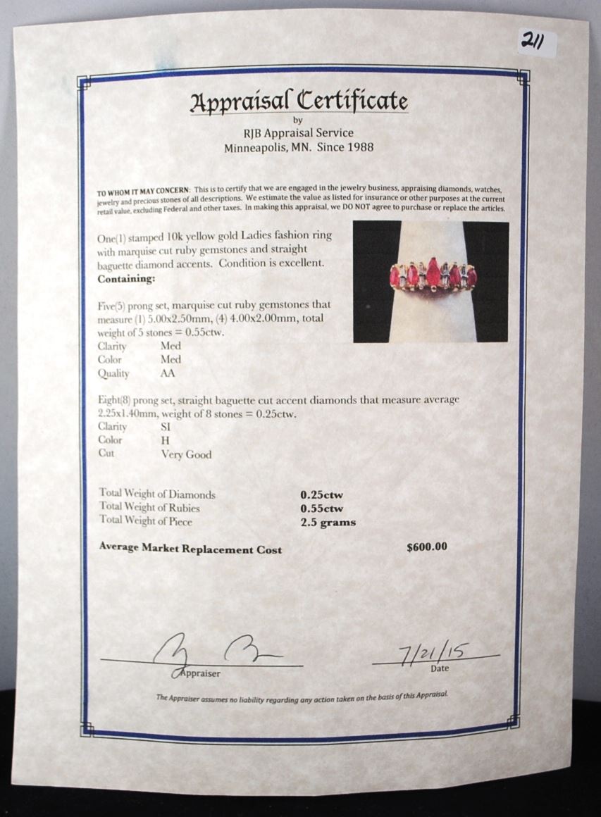 LADIES STAMPED 10K YELLOW GOLD FASHION RING  WITH FIVE PRONG SET, MARQUISE CUT RUBY  GEMSTONES THAT WEIGH 0.55CTW, MED CLARITY,  MED COLOR, AA QUALITY. AND EIGHT PRONG SET,  STRAIGHT BAGUETTE CUT ACCENT DIAMONDS THAT