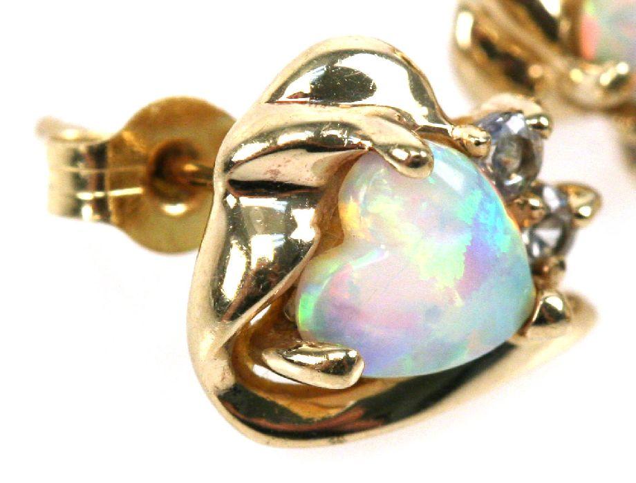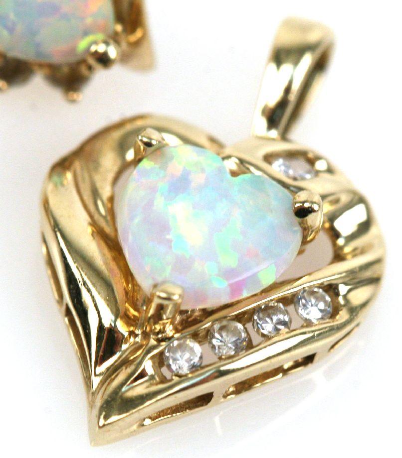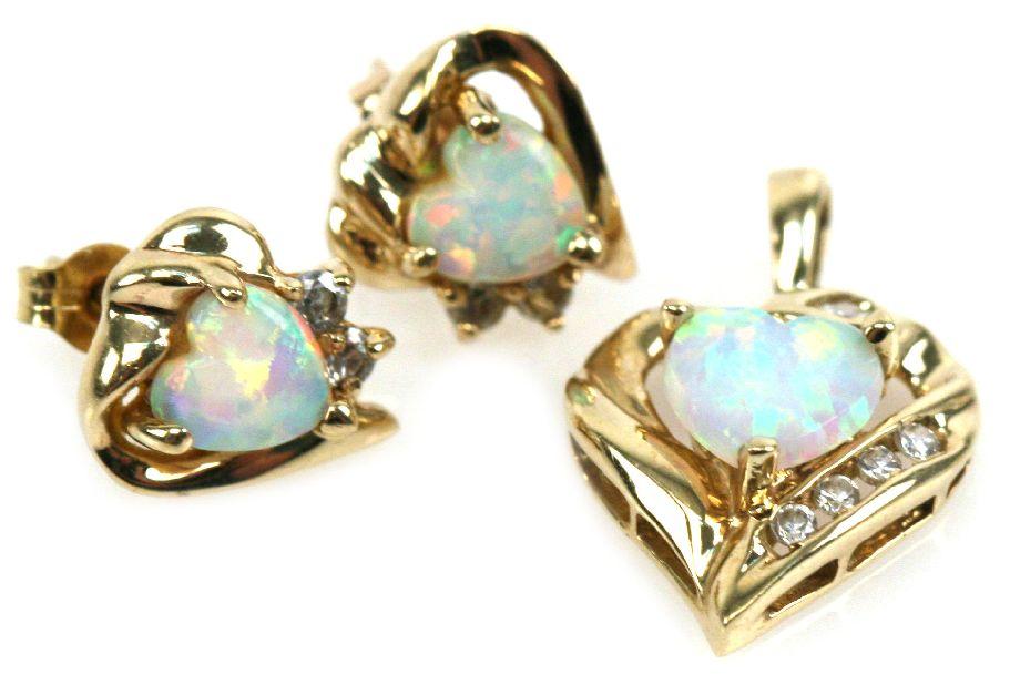 Ladies heart shaped post-back earrings with (2) approx. 0.09ct heart shaped opal cabochons and (4) full cut diamond accents. Matching pendant has an approx. 0.14ct heart shaped opal cabochon and (5) full cut diamond accents. Weight: 2.6 g Condition: Very good