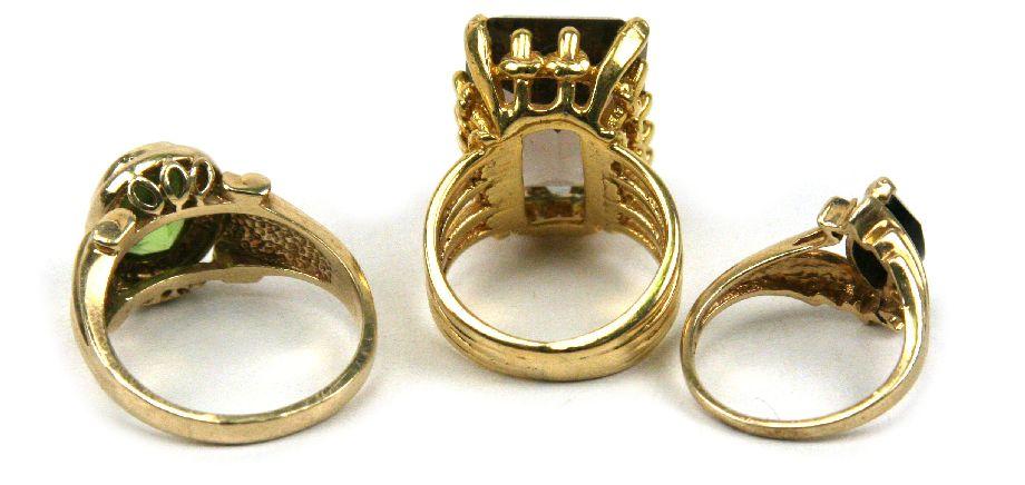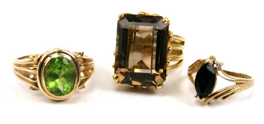 Ladies size 4 ring with marquise cut onyx cabochon and diamond accents. Ladies size 5 ring with and approx. 18ct emerald cut smoky topaz in a four-prong setting. Ladies size 8 ring with an approx. 2.5ct oval cut bezel set peridot. . Size: 4-8 . Weight: 18.9 g . Condition: Very good