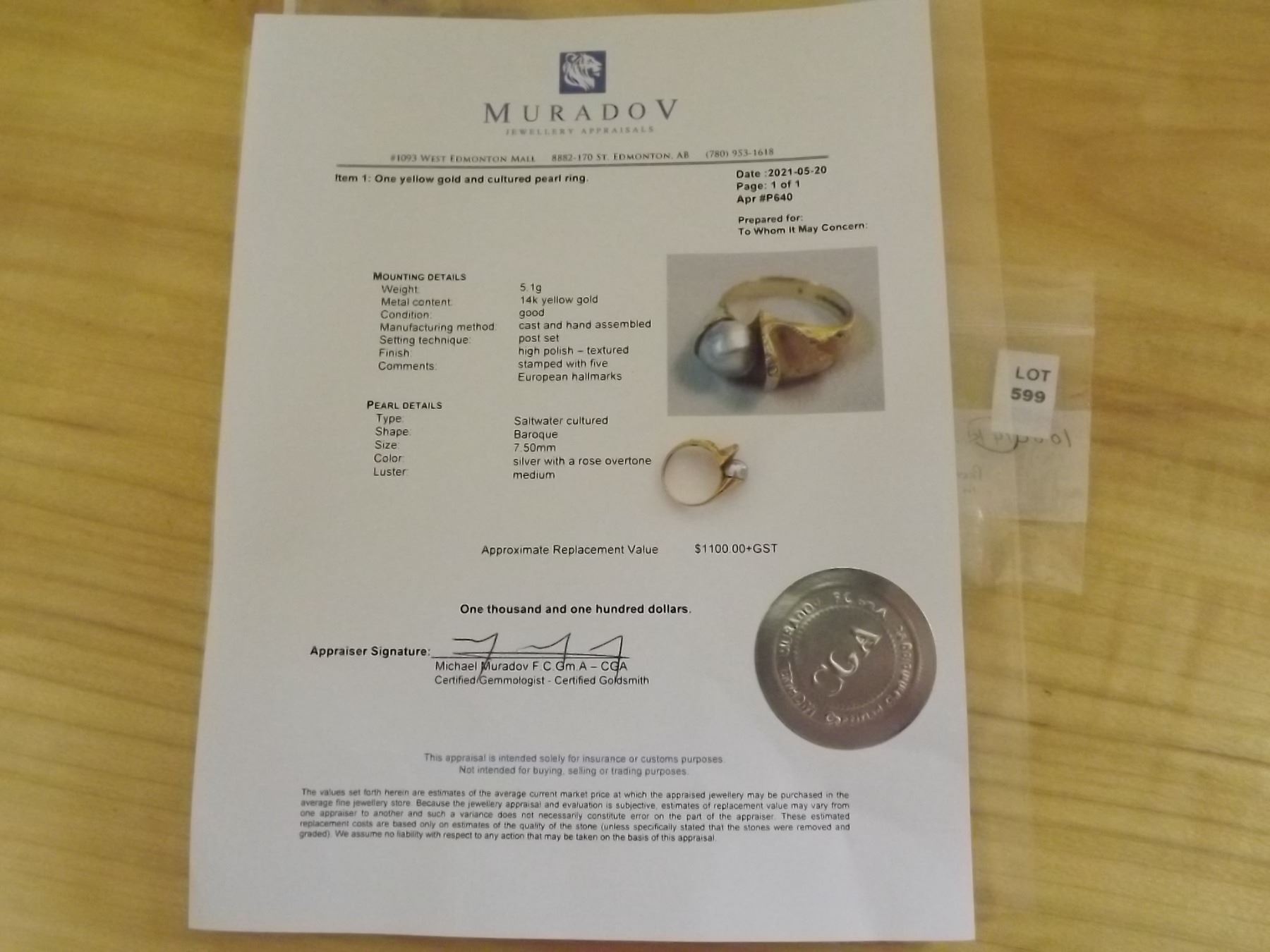 14 K 5.1 GRAMS LADIES RING SIZE 6.25 WITH SALTWATER CULTURED PEARLCOMES WITH APPRAISAL
