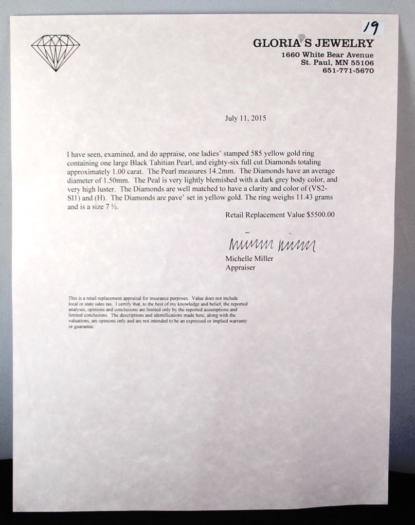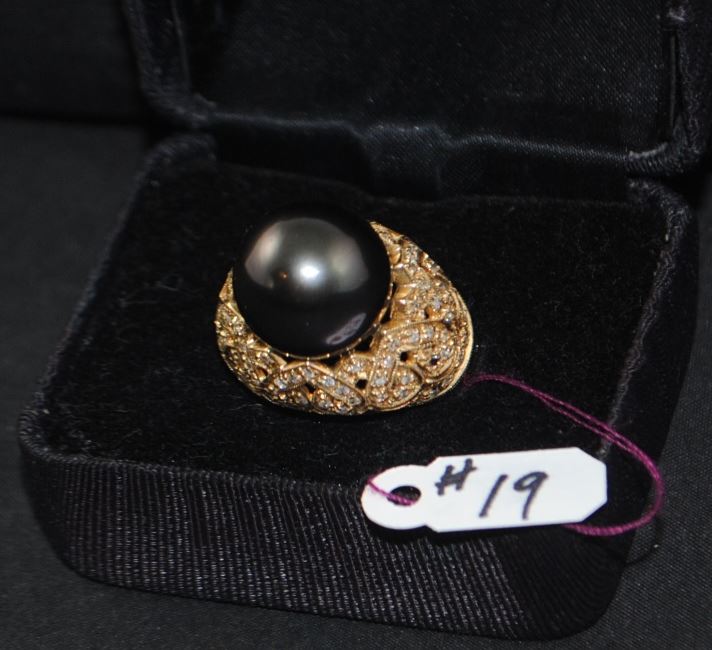 LADIES STAMPED 585 (14K) YELLOW GOLD RING CONTAINING ONE LARGE BLACK TAHITIAN PEARL, AND EIGHTY-SIX FULL CUT DIAMONDS TOTALING APPROX. 1.00 CARAT. THE PEARL MEASURES 14.2MM. THE PEARL IS VERY SLIGHTLY BLEMISHED