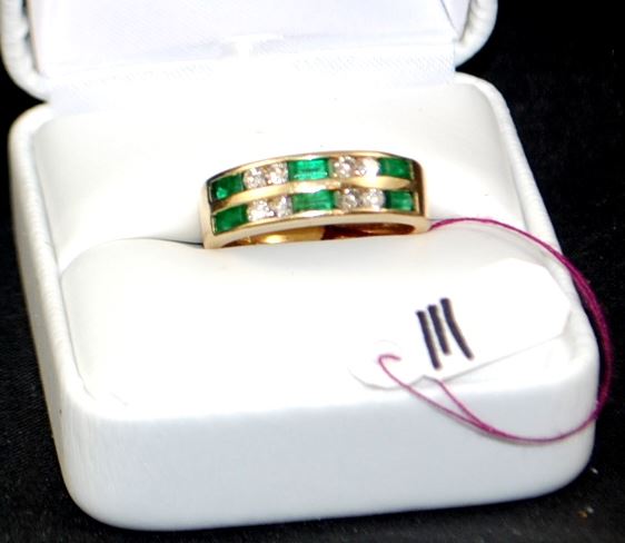 LADIES STAMPED 14K YELLOW GOLD DIAMOND AND EMERALD FASHION BAND WITH EIGHT CHANNEL SET, FULL ROUND CUT DIAMONDS THAT WEIGH 0.32CTW, SI1/SI2 CLARITY, H COLOR. AND SIX CHANNEL SET, STRAIGHT BAGUETTE CUT GREEN EMERALD