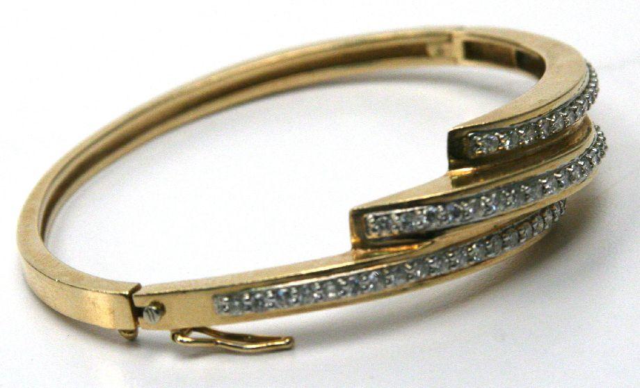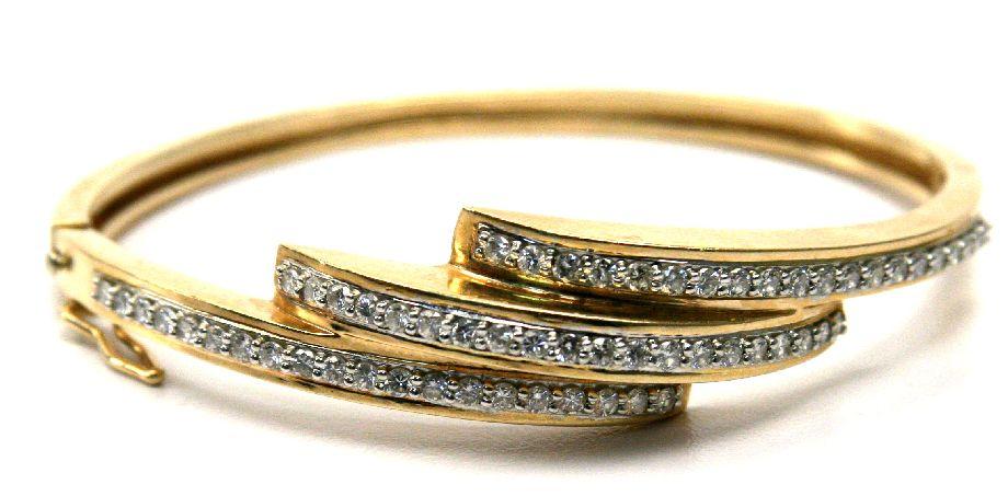 A ladies three tier diamond hinged bangle bracelet with (60) round cut diamonds totaling approximately 1.9 ctw. . Size: 6 . Weight: 23.6 g . Condition: Very good