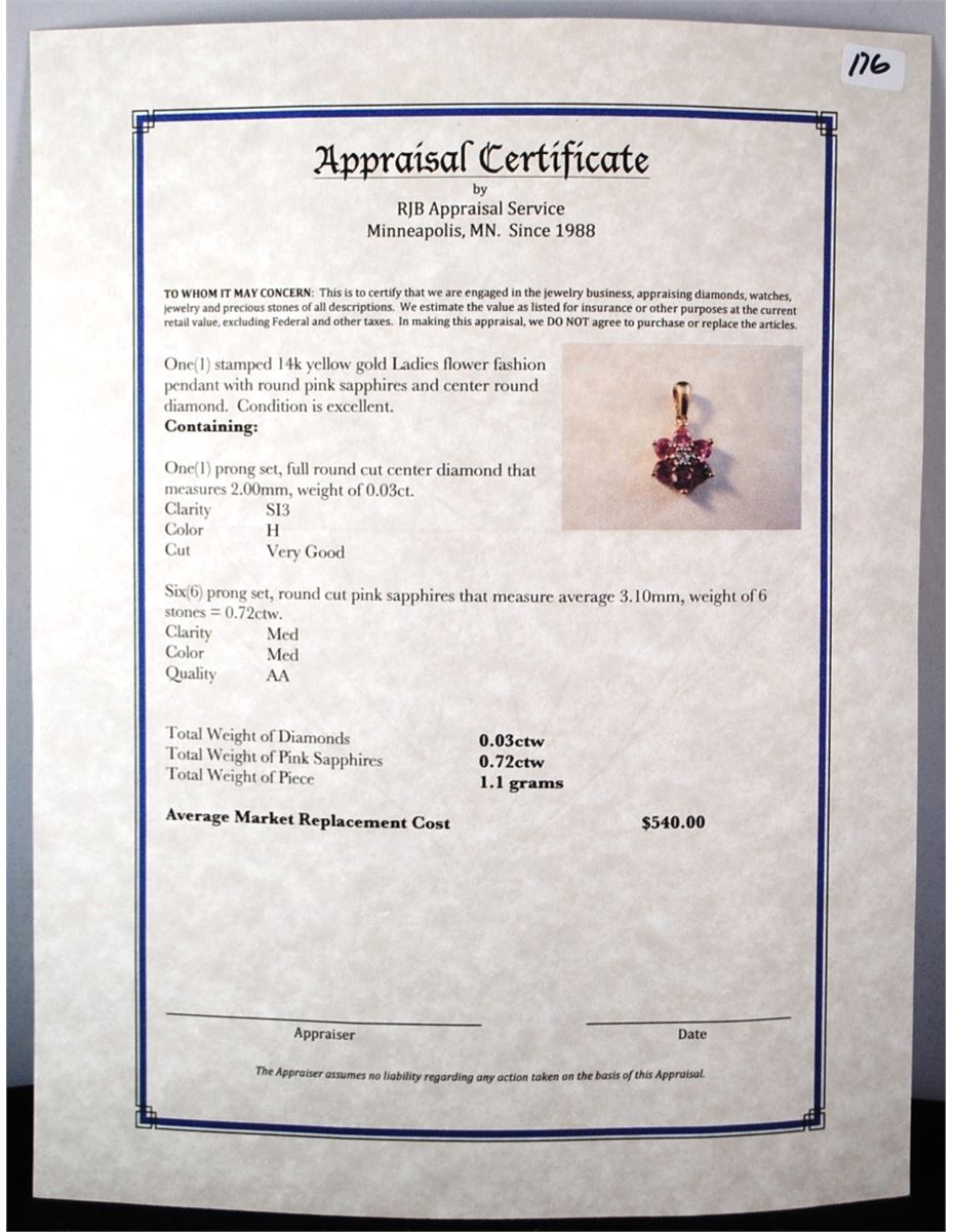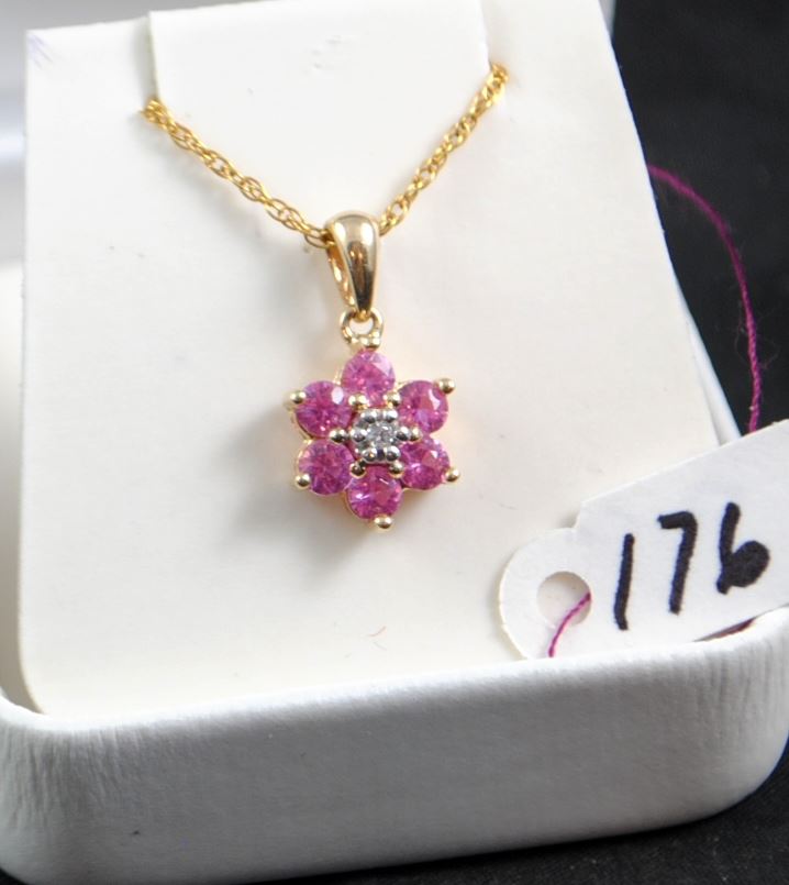 LADIES STAMPED 14K YELLOW GOLD FLOWER FASHION PENDANT WITH ONE PRONG SET, FULL ROUND CUT DIAMOND THAT WEIGHS 0.03CT, SI3 CLARITY, H COLOR. AND SIX PRONG SET, ROUND CUT PINK SAPPHIRES THAT WEIGH 0.72CTW, MED CLARITY,