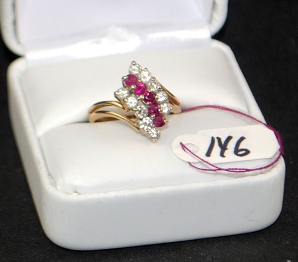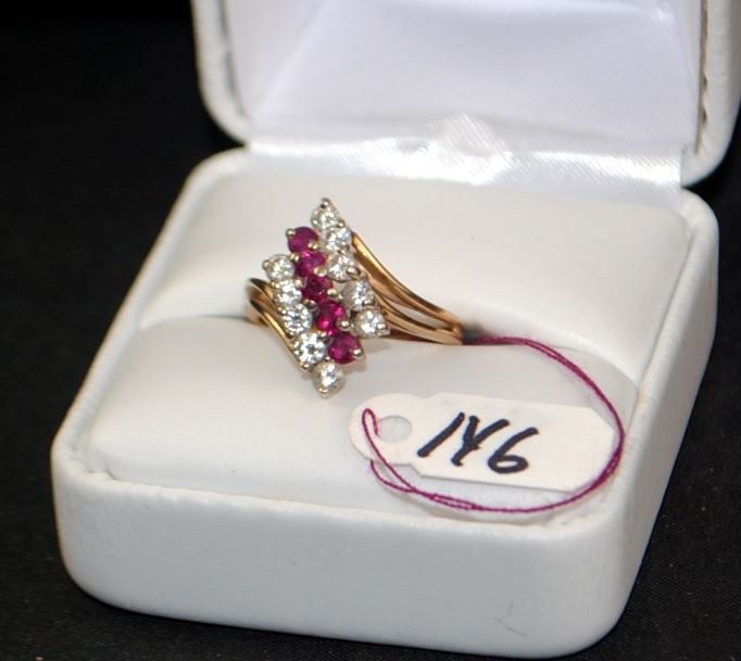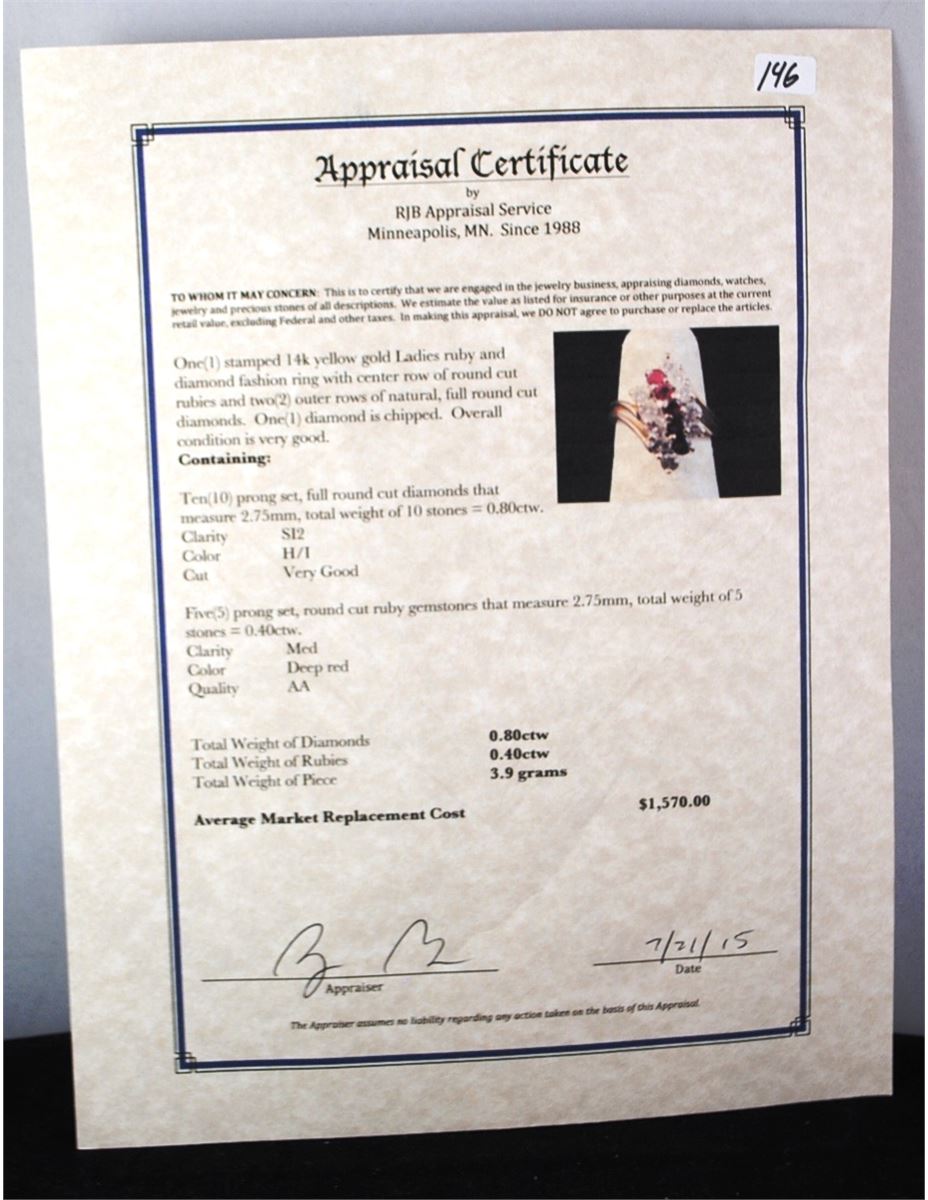 LADIES STAMPED 14K YELLOW GOLD RUBY AND DIAMOND FASHION RING WITH TEN PRONG SET, FULL ROUND CUT DIAMONDS THAT WEIGH 0.80CTW, SI2 CLARITY, H/I COLOR. AND FIVE PRONG SET, ROUND CUT RUBY GEMSTONES THAT WEIGH 0.40CTW, MED
