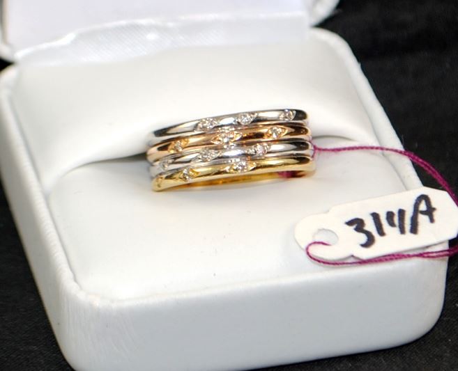 ONE STAMPED 18K YELLOW, WHITE AND ROSE GOLD LADIES MULTI-BAND FASHION RING WITH TWELVE PRONG-SET, FULL ROUND CUT ACCENT DIAMONDS THAT WEIGH 0.20CTW, SI1/SI2 CLARITY, G-H COLOR. THE AVERAGE MARKET REPLLACEMENT COST