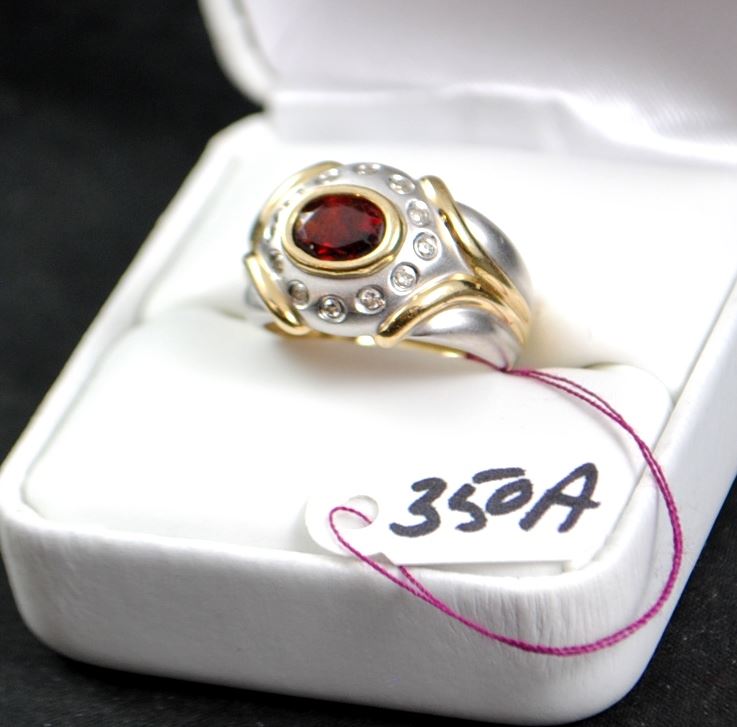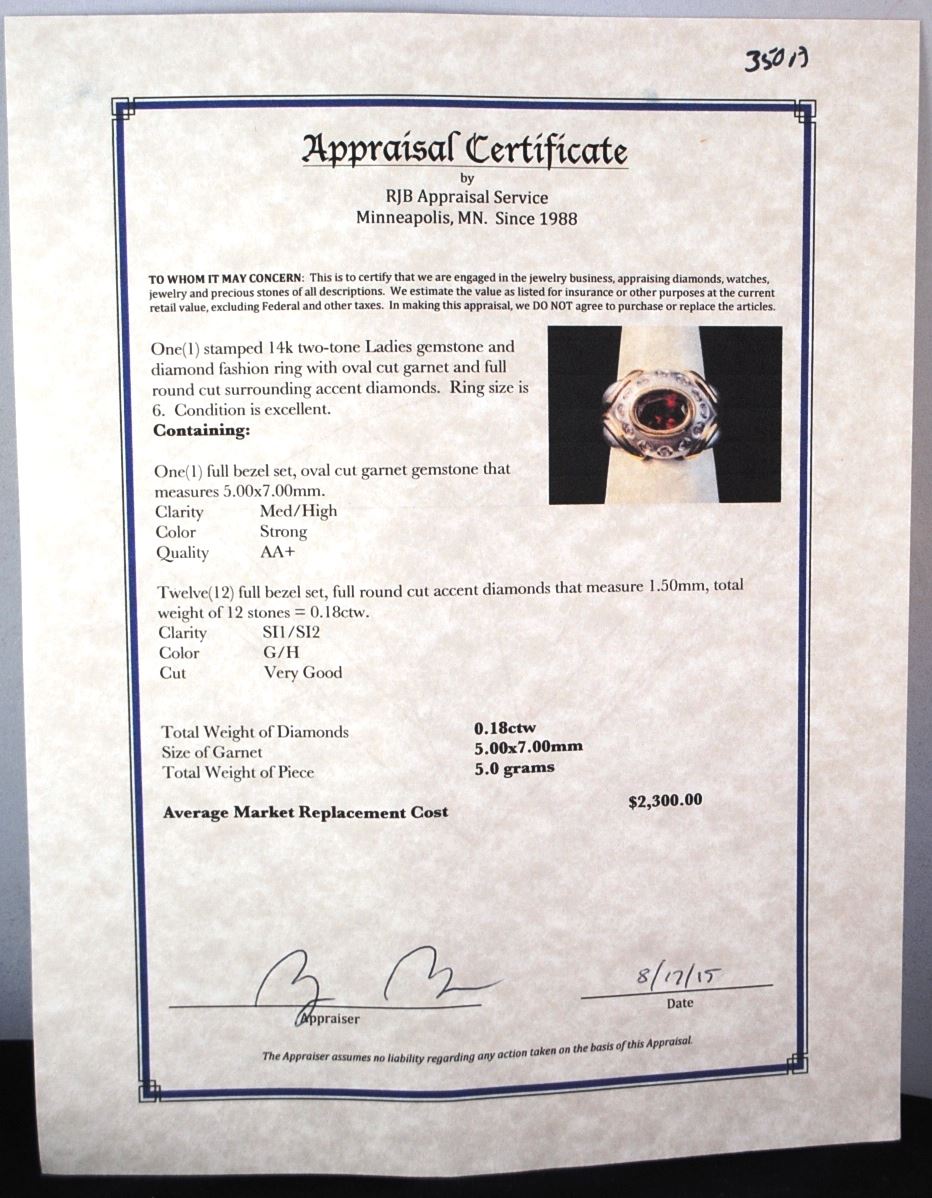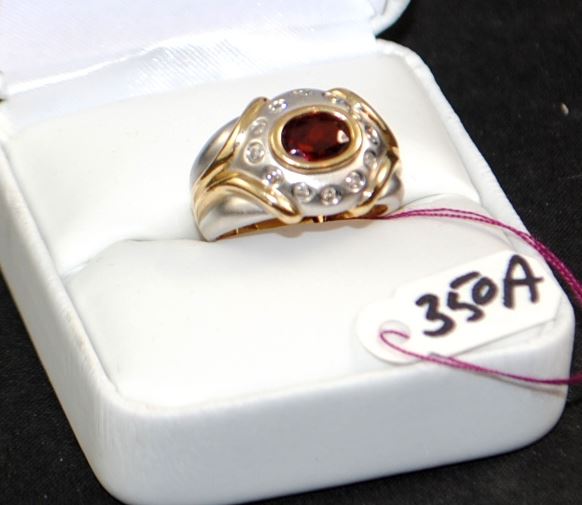 ONE STAMPED 14K TWO-TONE LADIES GEMSTONE AND DIAMOND FASHION RING WITH ONE FULL BEZEL SET, OVAL CUT GARNET GEMSTONE THAT MEASURES 5.00 X 7.00MM, MED/HIGH CLARITY, STRONG COLOR, AA+ QUALITY. AND TWELVE FULL BEZEL SET, FULL