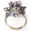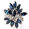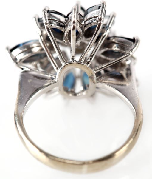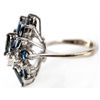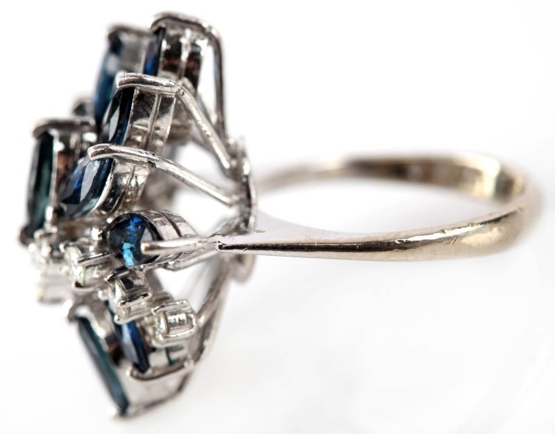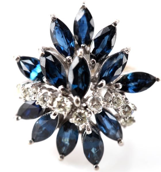 Unique, off-center design, waterfall cluster design measures 24 x 21mm, containing nine round brilliant cut diamonds, each weighing approximately .05ct, graded G/VS2, with good make. Approximate total weight of diamonds: .45ct.. Accenting diamonds are 13 marquise shape sapphires, each measuring approximately 6.2 x 3.4mm, medium bright blue color. Size: 5.5 Weight: 7.8 Condition: Very good; professionally re-finished.