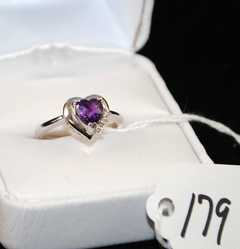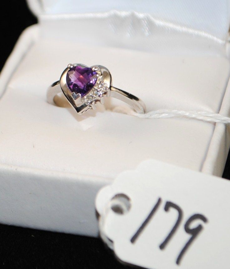 LADIES 14K WHITE GOLD AMETHYST AND DIAMOND RING WITH ONE HEART SHAPED AMETHYST CENTER AND THREE ROUND ACCENT DIAMONDS - APPRAISED RETAIL REPLACEMENT IS $1,250.00 - COMES WITH THE JEWELERS APPRAISAL CARD FOR INSURANCE