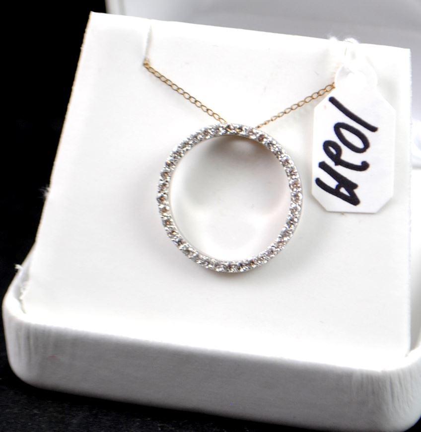 LADIES 14K WHITE GOLD DIAMOND CIRCLE PENDANT WITH FULL ROUND CUT DIAMONDS. PIECE IS ACCOMPANIED BY 14K GOLD FILLED NECKLACE. WITH THIRTY-SIX PRONG SET, FULL ROUND CUT DIAMONDS THAT WEIGH APPROX. 0.75CTW, SI2/SI3
