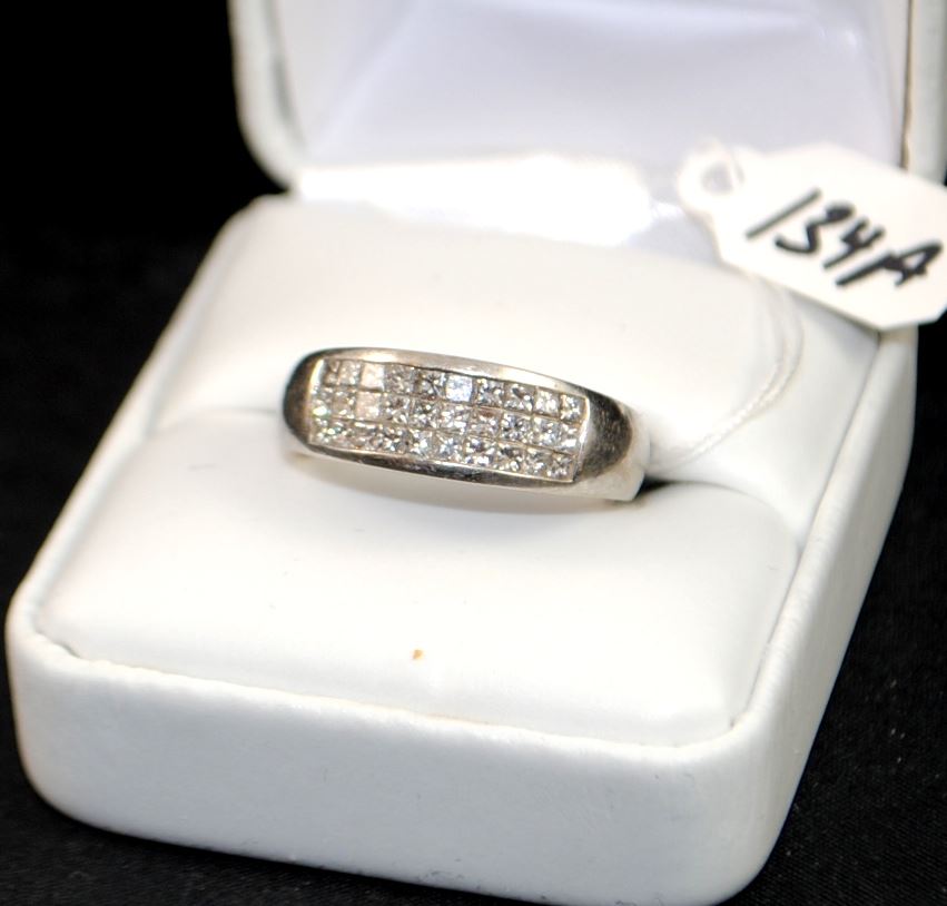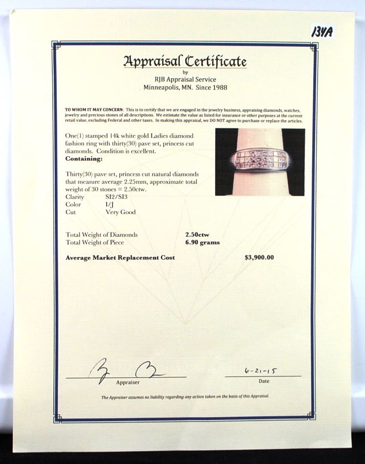 LADIES 14K WHITE GOLD DIAMOND FASHION RING WITH THIRTY PAVE SET, PRINCESS CUT NATURAL DIAMONDS THAT WEIGH APPROX. 2.50CTW, SI2-SI3 CLARITY, I-J COLOR. THE AVERAGE MARKET REPLACEMENT COST IS $3,900.00. AND COMES WITH