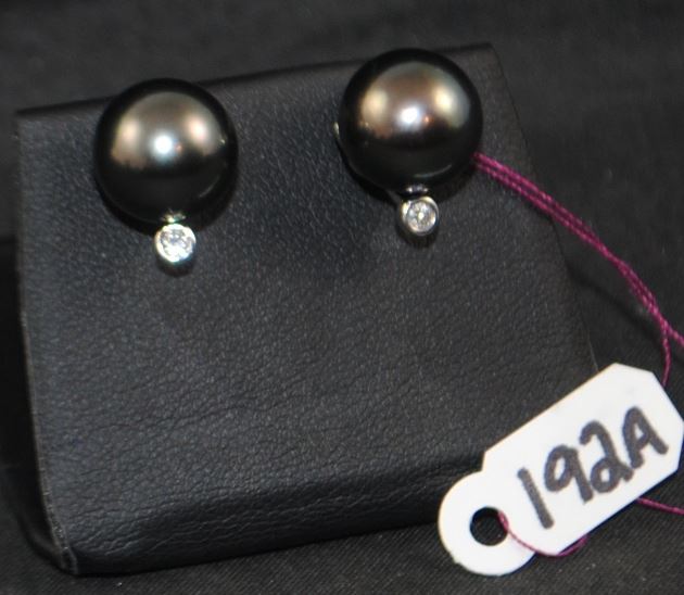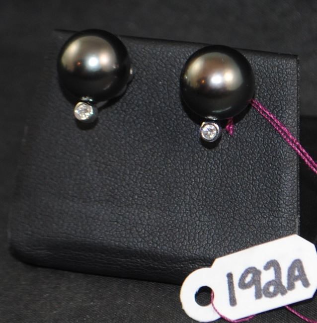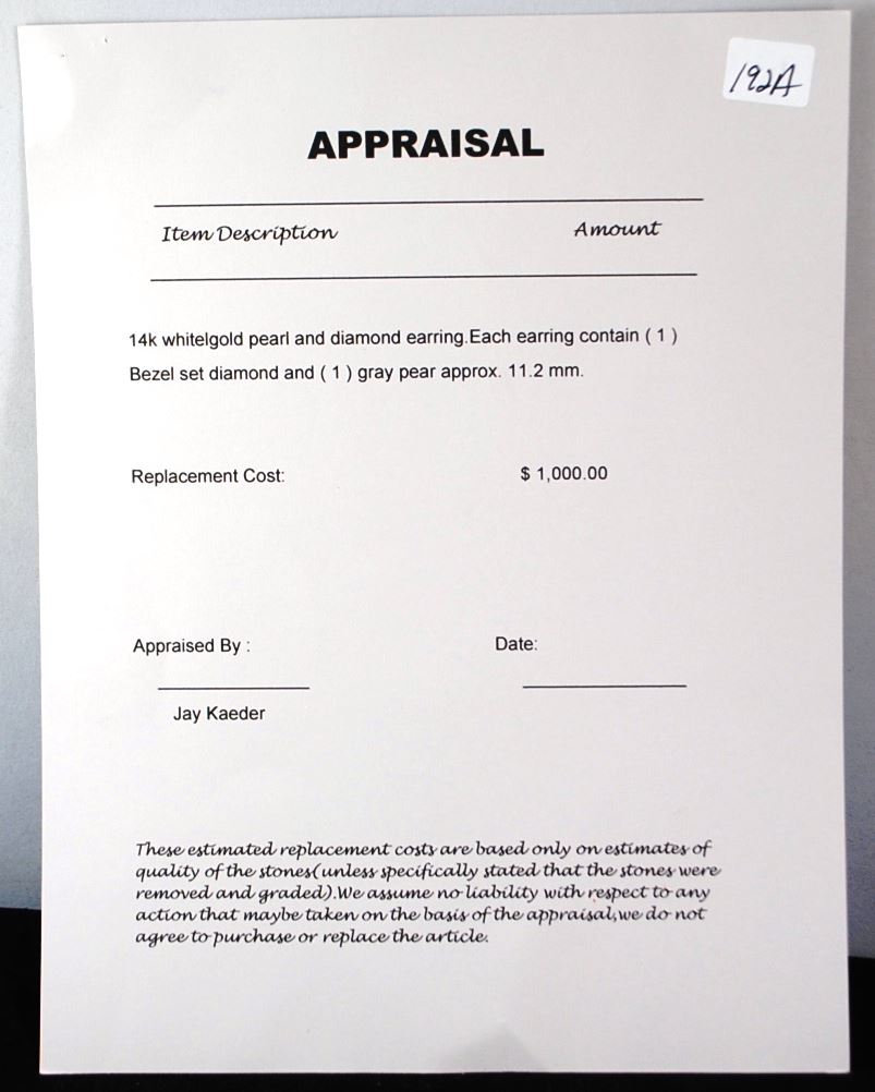 LADIES 14K WHITE GOLD PEARL & DIAMOND EARRINGS, CONTAINING ONE BEZEL SET DIAMOND & ONE GRAY PEARL. THE REPLACEMENT COST IS $1,000.00. AND COMES WITH THE APPRAISAL FOR INSURANCE PURPOSES.