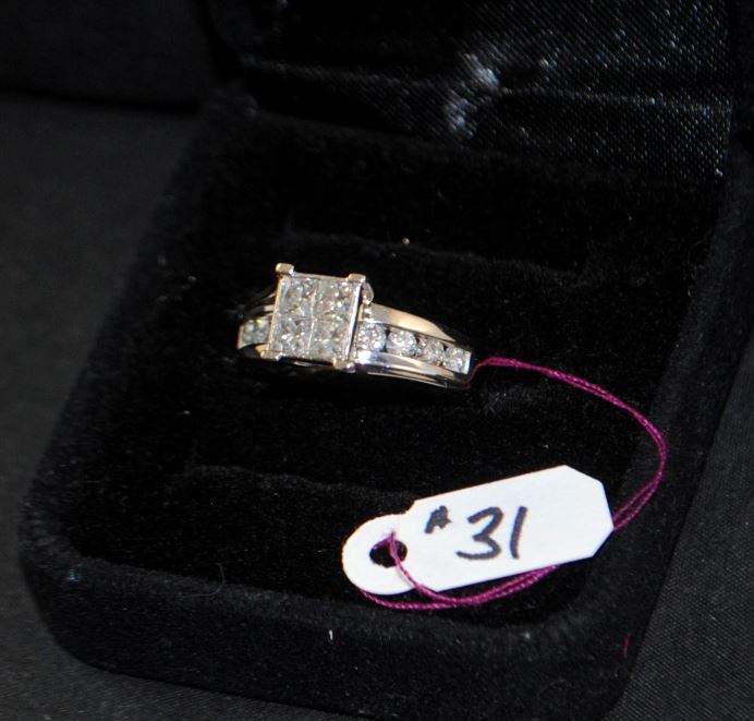 LADIES STAMPED 14K WHITE GOLD BRIDGE STYLE RING CONTAINING FOUR PRINCESS CUT CENTER DIAMONDS TOTALING APPROX. .64 CARAT, AND NINE FULL CUT DIAMONDS TOTALING APPROX. .86 CARAT. THE DIAMONDS HAVE A CLARITY AND COLOR