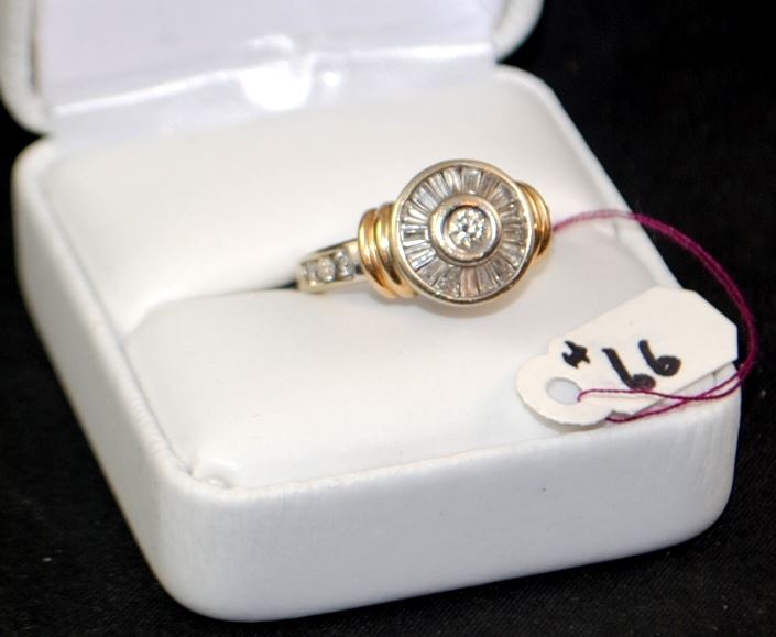 LADIES STAMPED 14K WHITE & YELLOW GOLD WASH DIAMOND FASHION RING. WITH ONE FULL BEZEL SET, ROUND CUT CENTER DIAMOND THAT WEIGHS 0.20CT, SI2 CLARITY, I COLOR. SEVENTEEN CHANNEL SET, TAPERED BAGUETTE CUT SURROUNDING