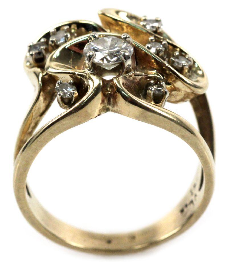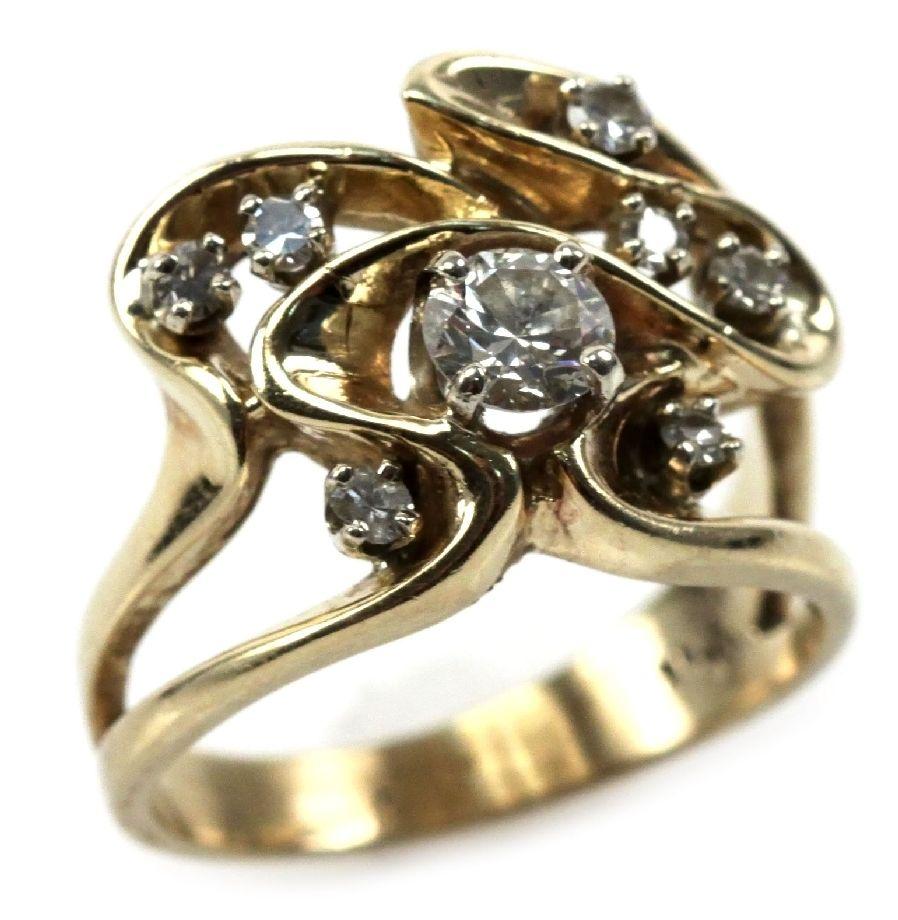 Ladies free-form ring with an approx. 0.375ct brilliant cut center diamond and (7) 0.03ct single cut diamonds. Approx. 0.79 ctw. . Size: 6 . Weight: 5.5 g . Condition: Very good