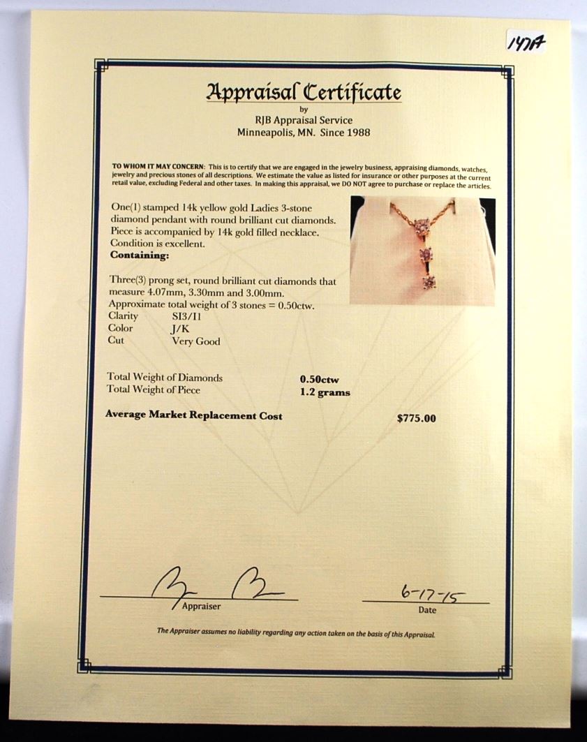 LADIES 14K YELLOW GOLD 3-STONE DIAMOND PENDANT AND ROUND BRILLIANT CUT DIAMONDS. THE PIECE IS ACCOMPANIED BY 14K GOLD FILLED NECKLACE. WITH 3-PRONG SET, ROUND BRILLIANT CUT DIAMONDS THAT WEIGH APPROX. 0.50CTW,