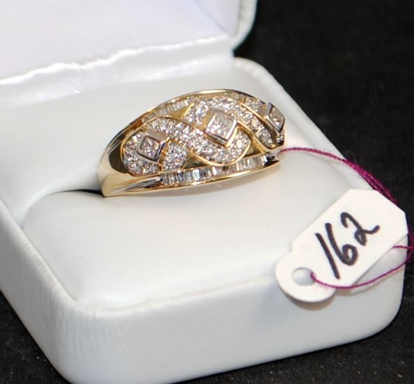ONE STAMPED 14K YELLOW GOLD MULTI DIAMOND FASHION RING WITH THREE FULL BEZEL SET, PRINCESS CUT DIAMONDS THAT WEIGH 0.40CTW, SI3 CLARITY, H COLOR. EIGHTEEN PRONG SET, FULL ROUND CUT ACCENT DIAMONDS THAT WEIGH 0.27CTW,