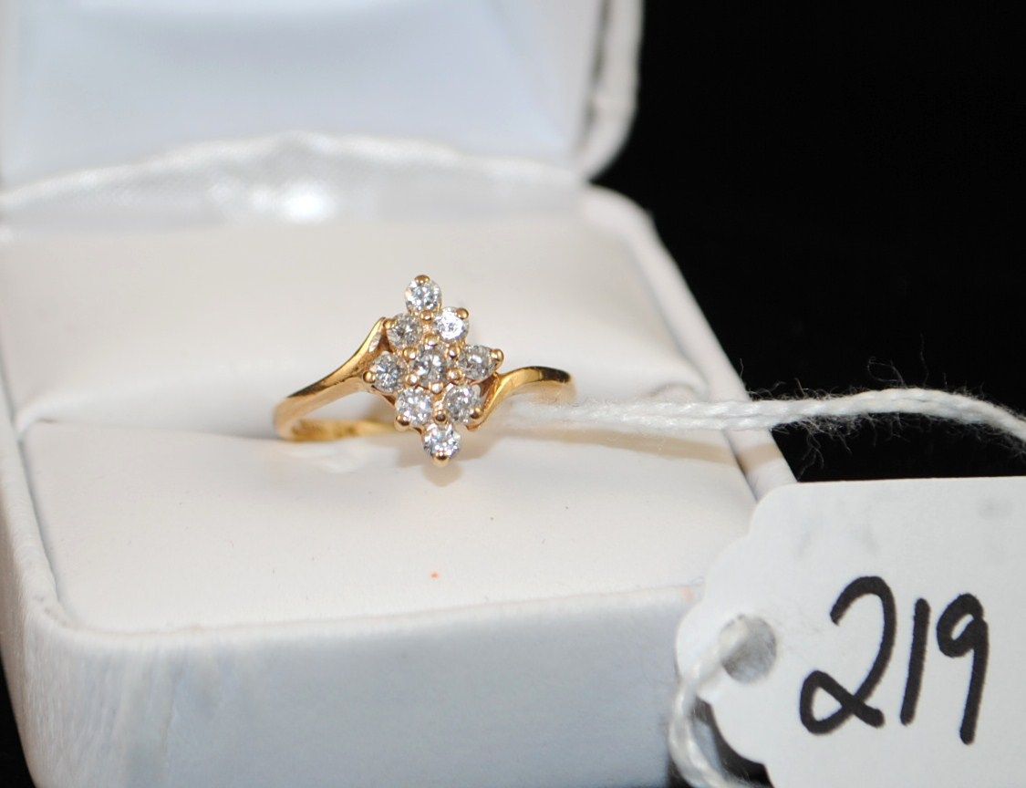 LADIES 14K YELLOW GOLD DIAMOND RING WITH NINE ROUND FULL CUT DIAMONDS - WEIGHS 2.1 GRAMS - APPRAISED RETAIL REPLACEMENT IS $1,125.00 - COMES WITH THE JEWELERS APPRAISAL CARD FOR INSURANCE