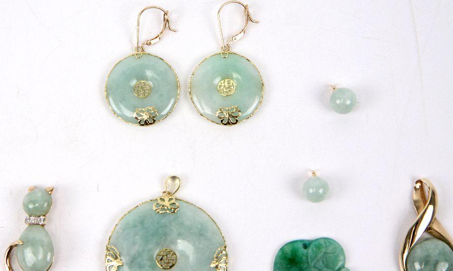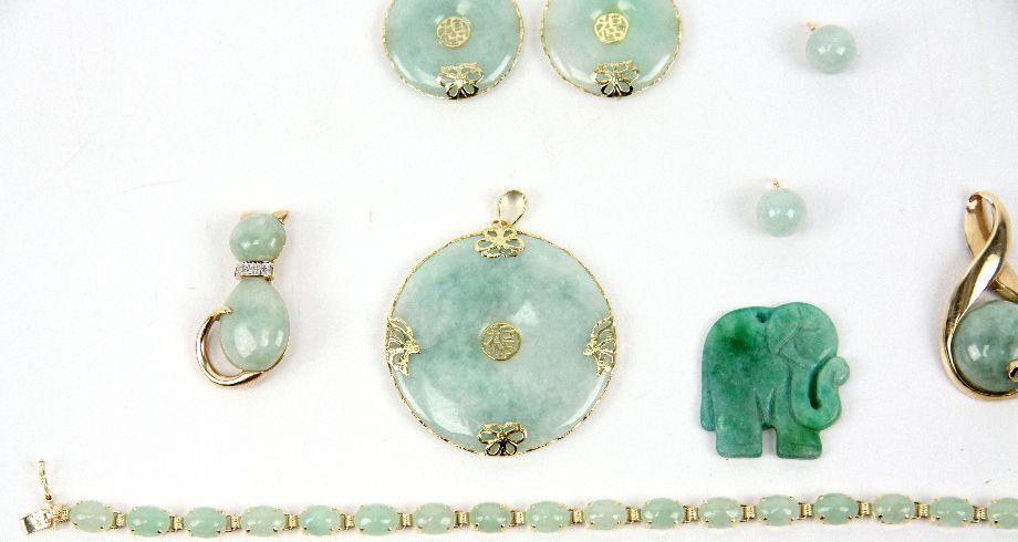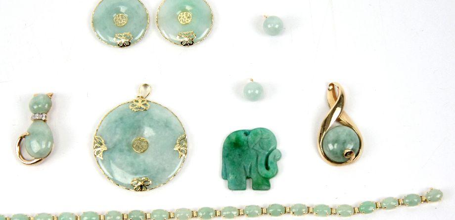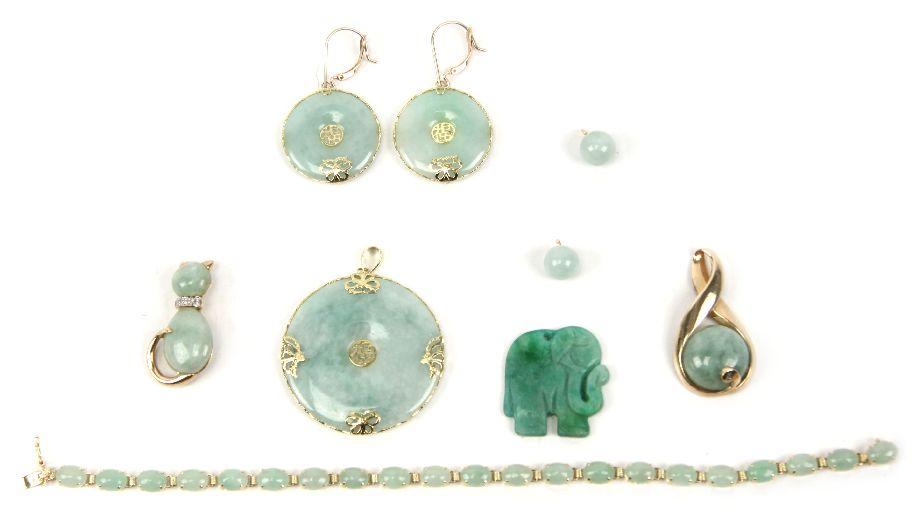 Collection of green jade jewelry, including: 7 inch bracelet with (21) approx. 0.6ct jade cabochon links, carved jade elephant pendant, (2) 8mm jade beads, pendant with an approx. 12.9ct jade cabochon with a diamond accent, cat form pin with jade cabochon body, and Asian earring and pendant set with green jade . Weight: 40.8 g . Condition: Very good