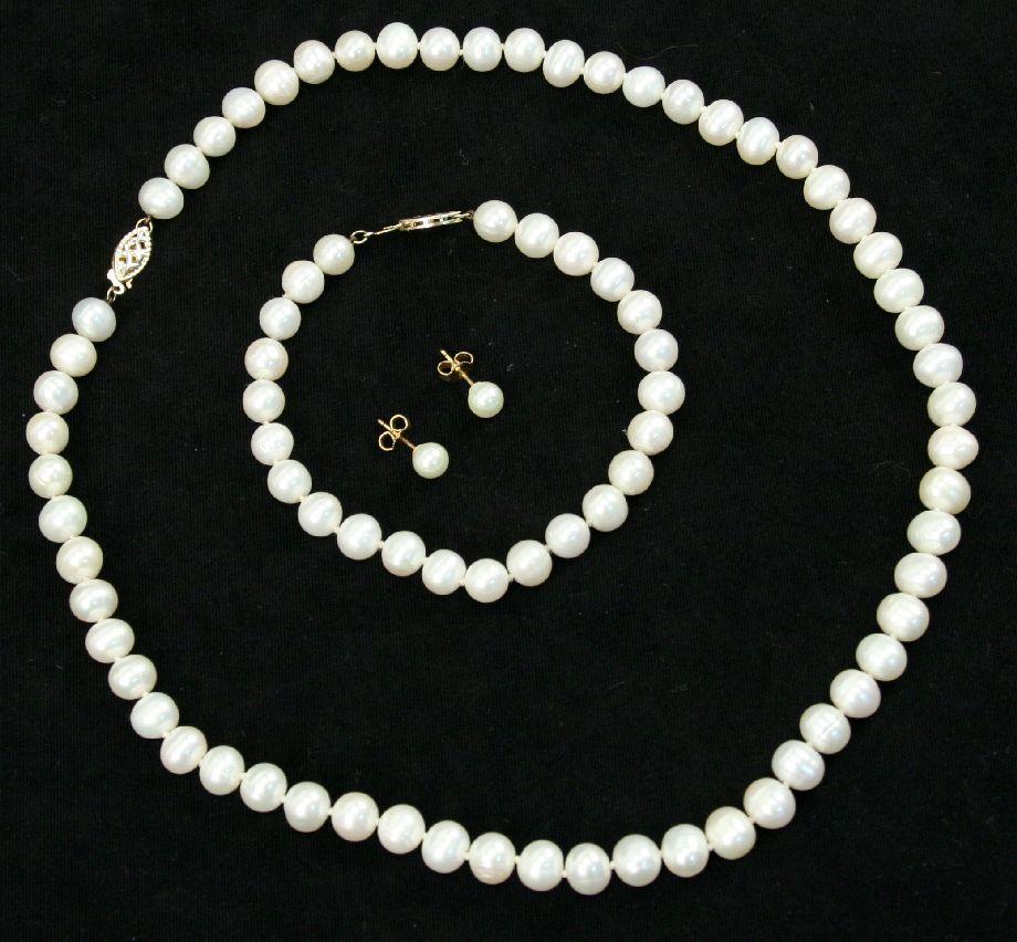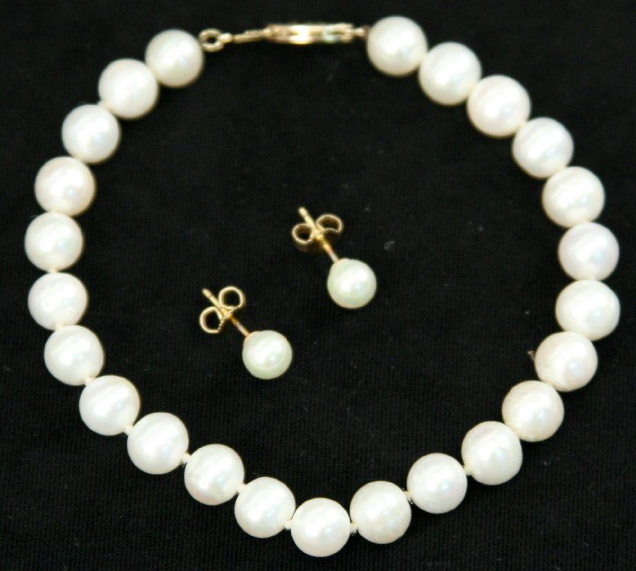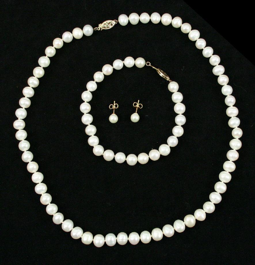 18 inch cultured pearl necklace strand of (59) 8mm white pearls with 14K gold claps, 8 inch matching bracelet with (24) 7mm pearls, and a pair of 6mm pearl stud earrings. . Weight: 50.9 g . Condition: Very good