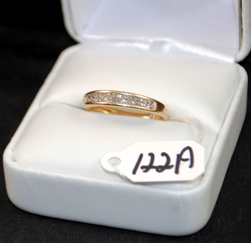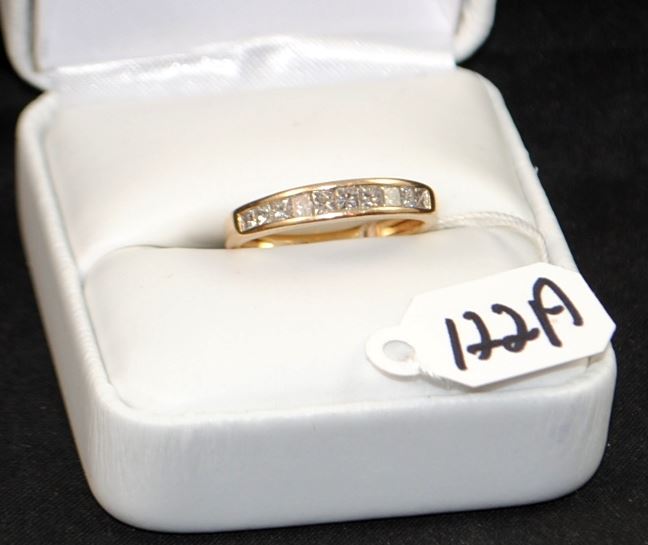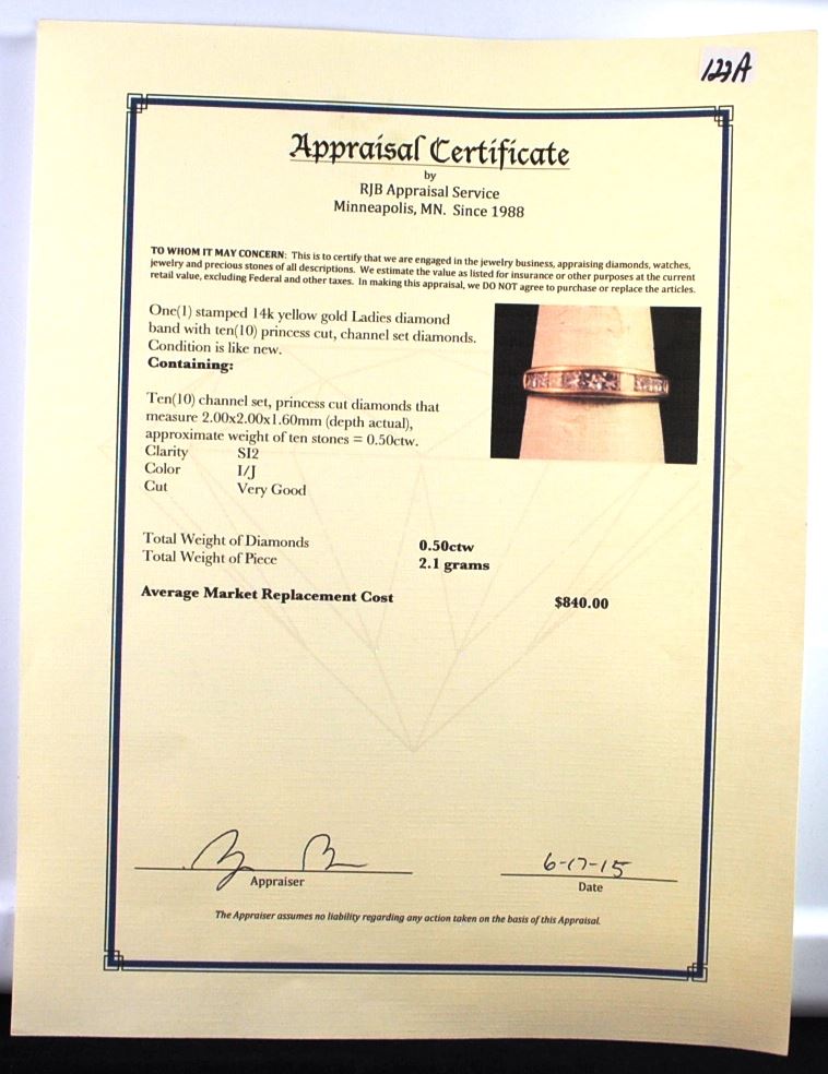 LADIES 14K YELLLOW GOLD DIAMOND BAND WITH TEN CHANNEL SET, PRINCESS CUT DIAMONDS THAT WEIGH 0.50CTW, SI2 CLARITY, I-J COLOR. THE AVERAGE REPLACEMENT COST IS $840.00. AND COMES WITH THE APPRAISAL FOR INSURANCE