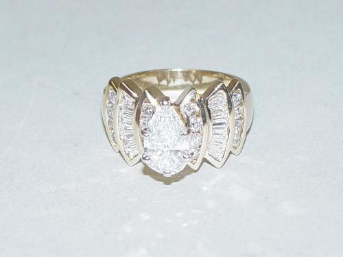 LADIES 14K YELLOW GOLD RING W/ PEAR SHAPED DIAMOND RING W/ 2 ROWS OF ROUND BRILLIANT & 1 ROW OF TAPERED BAGUETTE DIAMONDS ON EITHER SIDE (PEAR SHAPED DIAMOND- APPROX. 1 CARAT, SIDE DIAMONDS-APPROX. 1/3 CARAT; TOTAL DIAMOND WEIGHT- 1 1/3 CARATS)