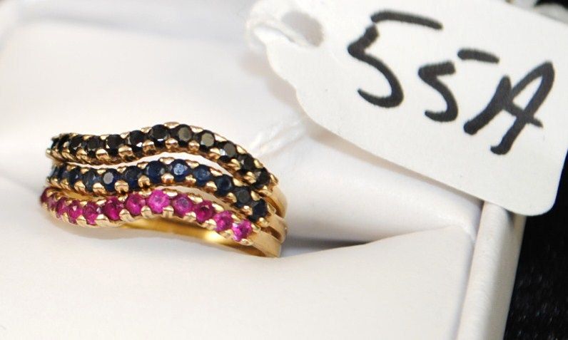 LADIES 14K YELLOW GOLD THREE RING SET - ONE RING IS SET WITH RUBIES AND TWO ARE SET WITH SAPPHIRES - WEIGHS 4.0 GRAMS - APPRAISED RETAIL REPLACEMENT IS $2,500.00 - COMES WITH THE JEWELERS APPRAISAL CARD!
