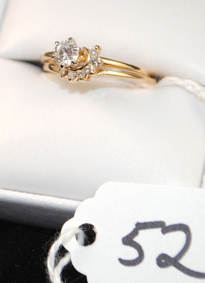 LADIES 14K YELLOW GOLD WEDDING SET WITH ONE APPROX. 1/3CT ROUND DIAMOND SOLITAIRE IN ENGAGEMENT RING AND SIX ROUND FULL CUT DIAMOND IN THE WEDDING BAND - APPRAISED RETAIL REPLACEMENT IS $2,500.00 - COMES WITH THE JEWELERS APPRAISAL CARD FOR INSURANCE PURPOSES!