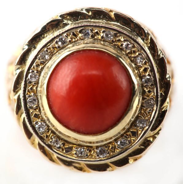Measuring 17mm in diameter, this open work dome type ring contains one cabochon cut red coral, 10mm in diameter, surrounded by 16 round full cut diamonds, bead set, each weighing approximately .015ct, for an approximate total diamond weight of .25. Size: 5.0 Weight: 9.0 Condition: Very good; professionally re-finished.