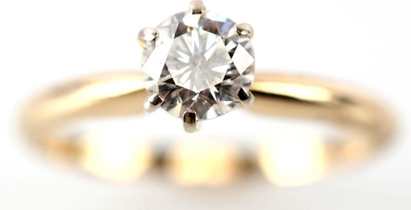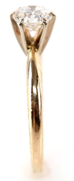 Six prong, white gold Tiffany type head, combined with tapered shoulder yellow gold shank, containing one round brilliant cut diamond, weighing approximately .66cts., graded G-H/Si2, with very nice make. Faces up very well. Size: 6.5 Weight: 2.0 Condition: Very good.