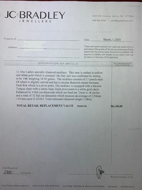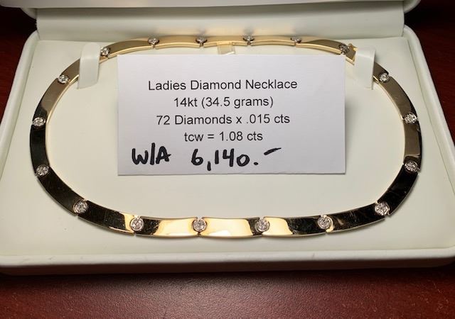 LADIES 14KT DIAMOND 16" NECKLACE (34.5G), 72 DIAMONDS X .015CTS, TCW=1.08CTS WITH LOCAL APPRAISAL OF $6,140.00 (MARCH 1, 2021)