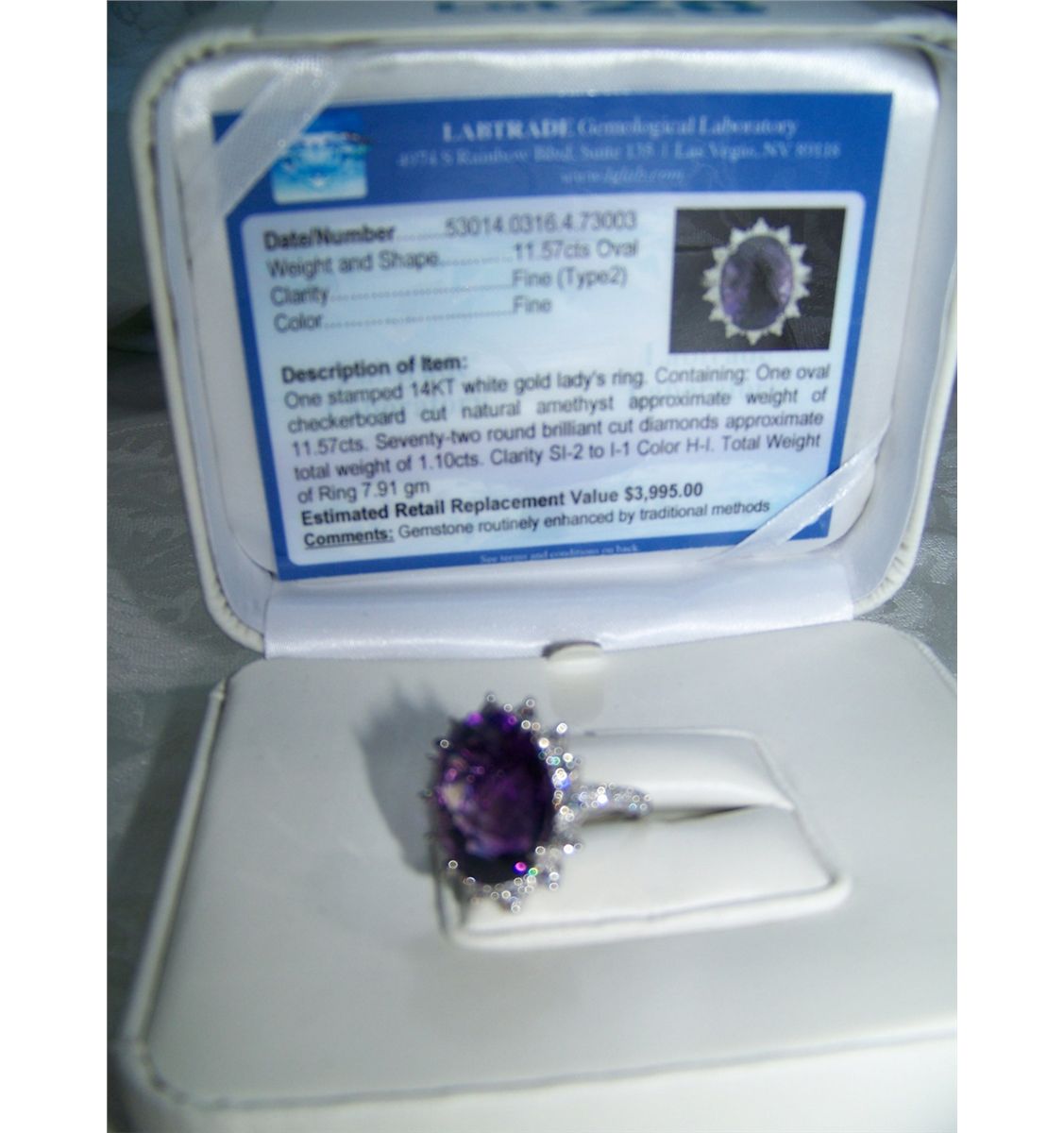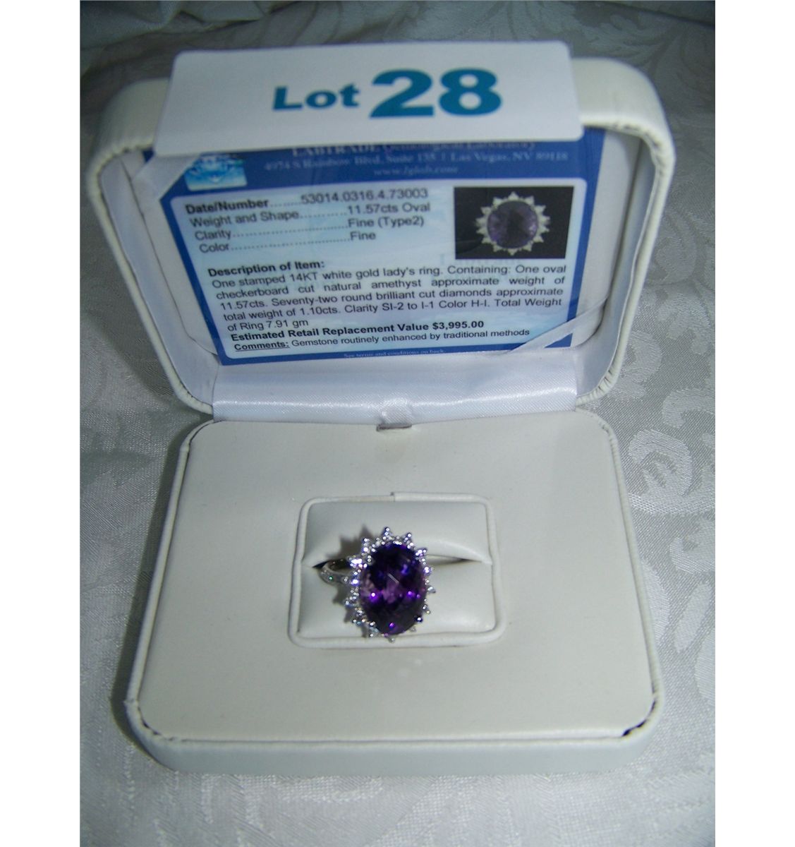 APPRAISAL READS: ONE STAMPED 14KT WHITE GOLD RING CONTAINING ONE OVAL CHECKERBOARD CUT NATURAL AMETHYST APPRX. WEIGHT OF 11.57 CTS. SEVENTY-TWO (72) ROUND CUT BRILLIANT CUT DIAMONDS APPRX. WEIGHT 1.10CTS CLARITY SI-2 TO I-1 COLOR H-1. TOTAL WEIGHT OF RING 7.91 GRAMS
