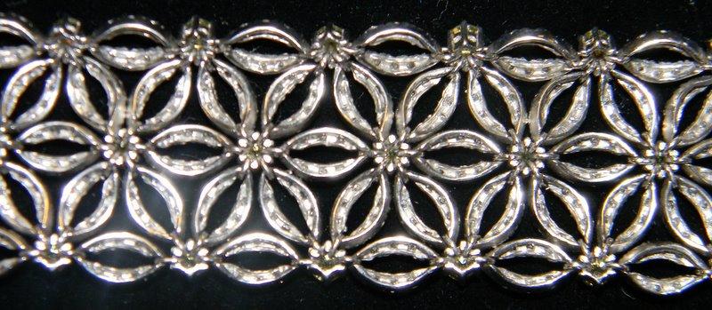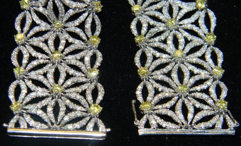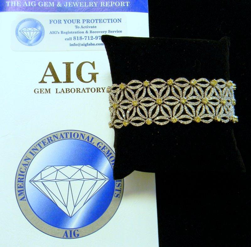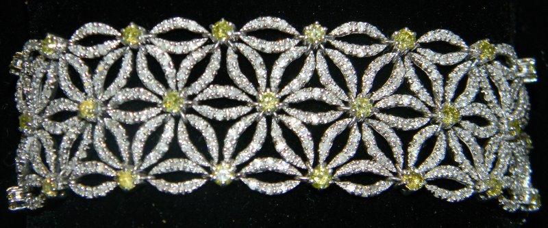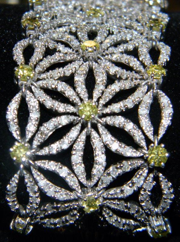 Fabulous 14kt white gold diamond bracelet with a flexible articulated mesh strap, featuring cascading open work designed diamond florets. 7" length, 25mm width. Bar clasp with safety. Marked 14k Italy. 41 prong set round cut diamonds fancy yellow approx. 4.35ct. total weight. Five hundred eighty eight prong set round cut diamonds, approx. weight 6.48ct. For a total weight of 10.83ct. Approximate weight of bracelet is 42.4 grams. AIG certified in 2005.