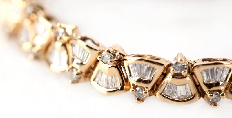 Beautiful, high-labor setting work and assembly in creating this low profile diamond bracelet; contains 36 round full cut diamonds and 144 tapered baguette cut diamonds. Graded G/VS1 with fine make. Approximate total diamond weight 44cts. Size: 7.0" Weight: 21.2 Condition: Very good.