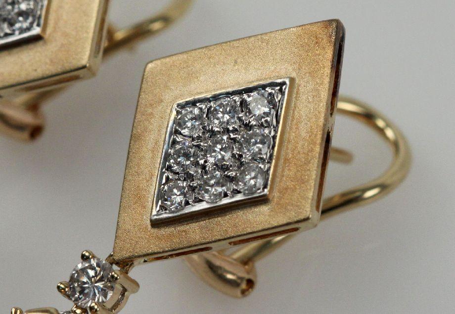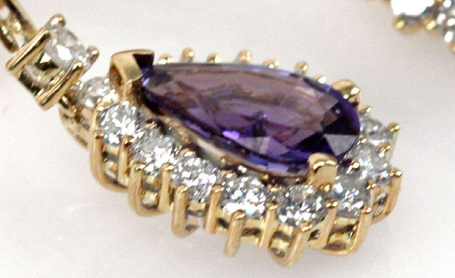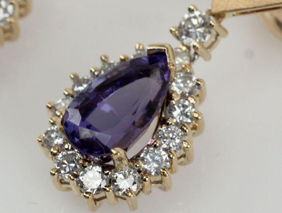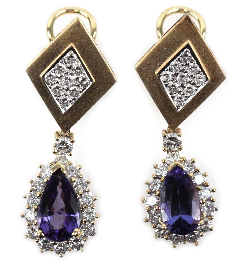 Ladies 18K yellow gold omega-back earrings with (2) 4.8 ct pear cut tanzanites and 45 round brilliant cut diamonds of G to H color and VS-1 to SI-1 clarity totaling approx. 2.01 ctw. Includes Registered information and certificate of authenticity. . Weight: 13.2 g . Condition: Very good