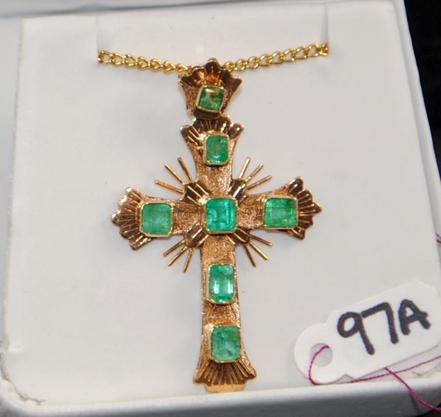 LADIES 18K WHITE GOLD CROSS, SUNBURST CONTAINING 7 NATURAL EMERALDS. THE REPLACEMENT COST IS $2,900.00. AND COMES WITH THE APPRAISAL FOR INSURANCE PURPOSES.