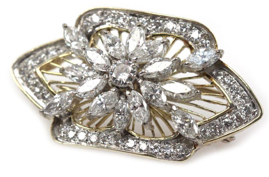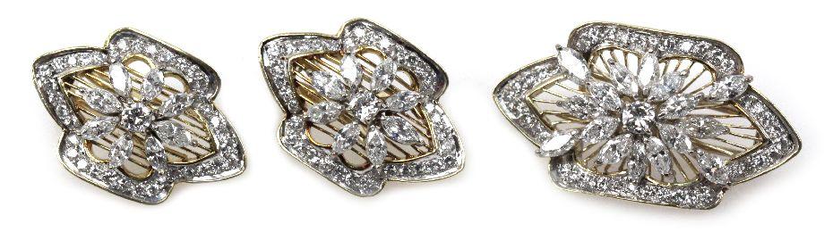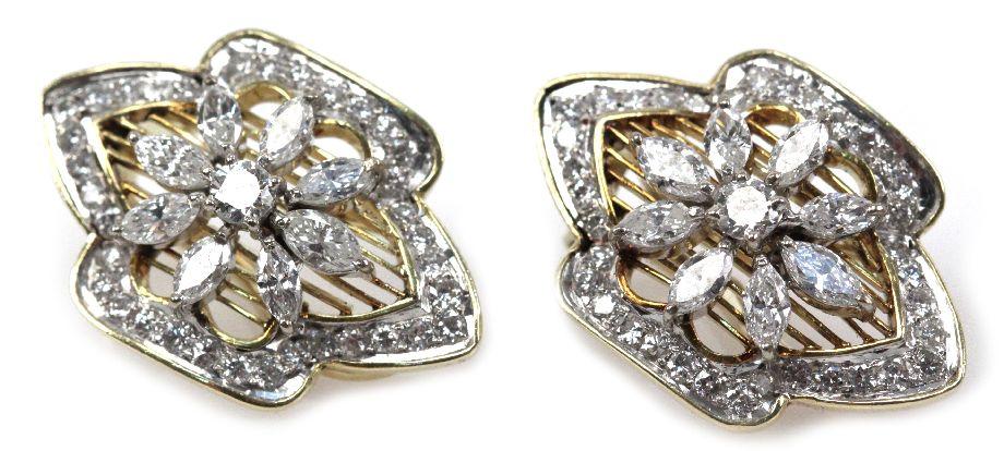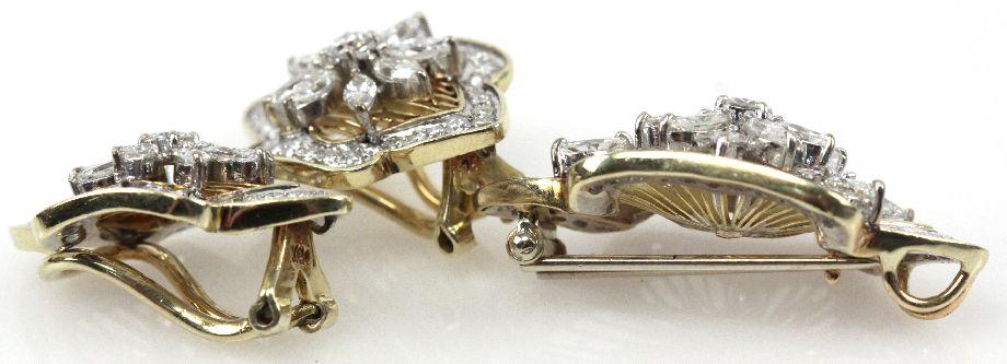 Ladies clip earrings with (16) 0.12 to 0.15ct marquise cut diamonds of VVS-2 to SI-2 clarity and E to G color and (74) 0.015 to 0.12ct full cut diamonds of VS-2 to SI-1 clarity and E to G color, totaling 3.66 ctw. Ladies brooch/pendant with (16) 0.14 to 0.17ct marquise cut diamonds of E to I color and VVS-2 to SI-1 clarity, (1) 0.16ct full cut diamond of G color and SI-1 clarity, and (40) 0.01 to 0.02ct full cut diamonds of G color and VVS-2 to SI-1 clarity, totaling approx. 3.05 ctw. Includes 2010 appraisal of $12,500. . Weight: 23.2 g . Condition: Good condition with 2 diamonds with a chip.