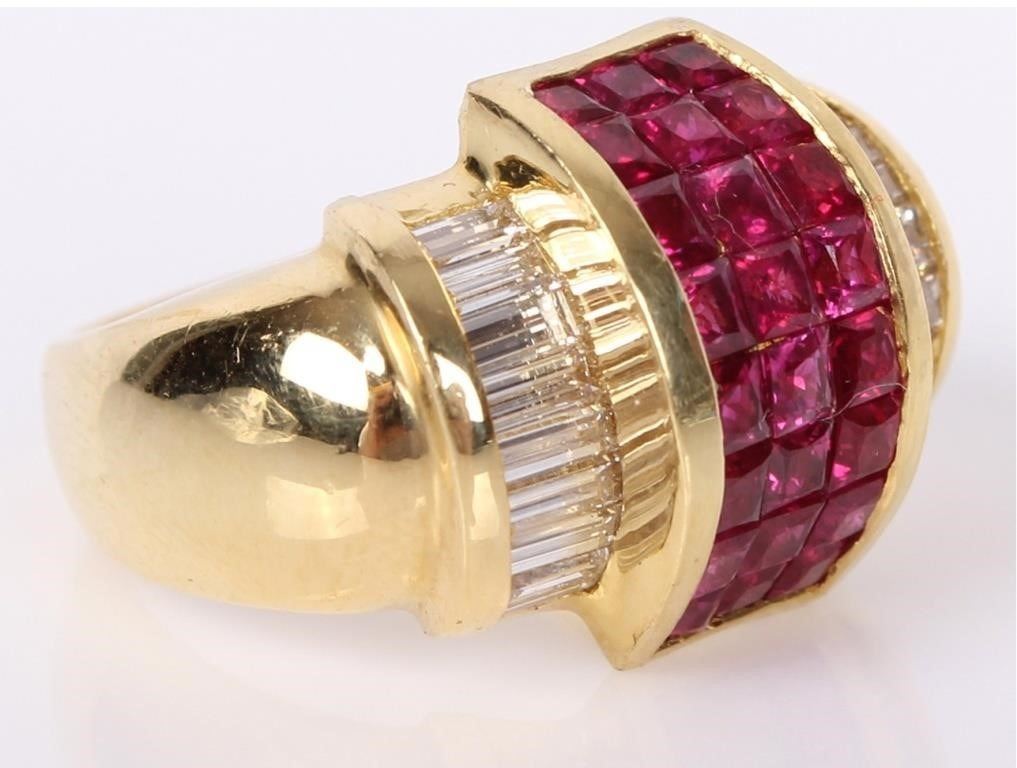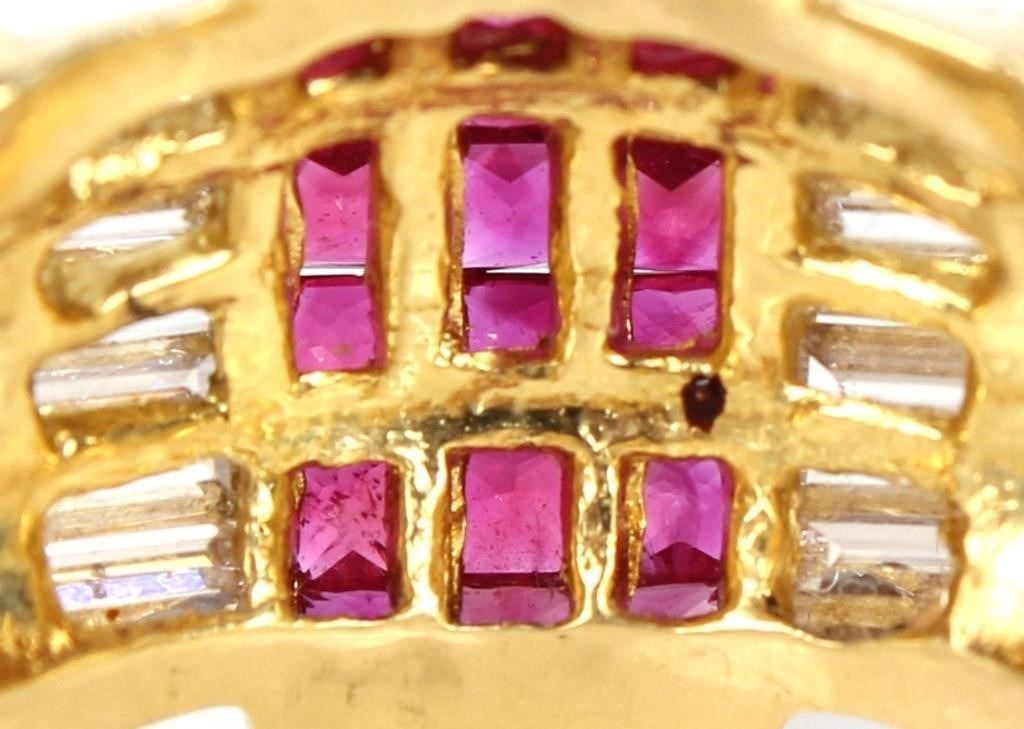 Ladies 18K yellow gold diamond and red ruby dinner ring, featuring a grouping of 24 channel set square cut rubies of 2mm, accented by exquisite baguette white diamonds of approximately .60CTW.