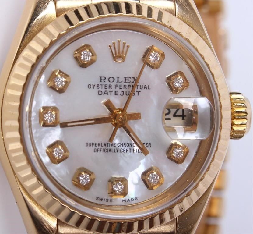 Ladies 18k yellow gold Rolex Oyster Perpetual Datejust wristwatch reference 69178. Solid yellow gold body and presidential bracelet, serial L677XX to date c. 1989. Elegant mother of pearl dial with diamond indices.