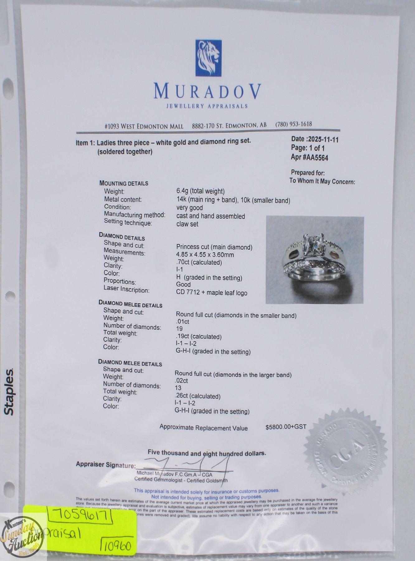 TOTAL WEIGHT 6.4G, MAIN BAND + LARGER BAND ARE 14K GOLD, SMALLER BAND IS 10K, CAST AND HAND ASSEMBLED, CLAW SET CONTAINING PRINCESS CUT I-1 H DIAMOND MEASURING 4.85 X 4.55 X 3.60MM, TOTAL WEIGHT .70CT (CALCULATED), LASER INSCRIBED CD 7712 + MAPLE LEAF LOGO.