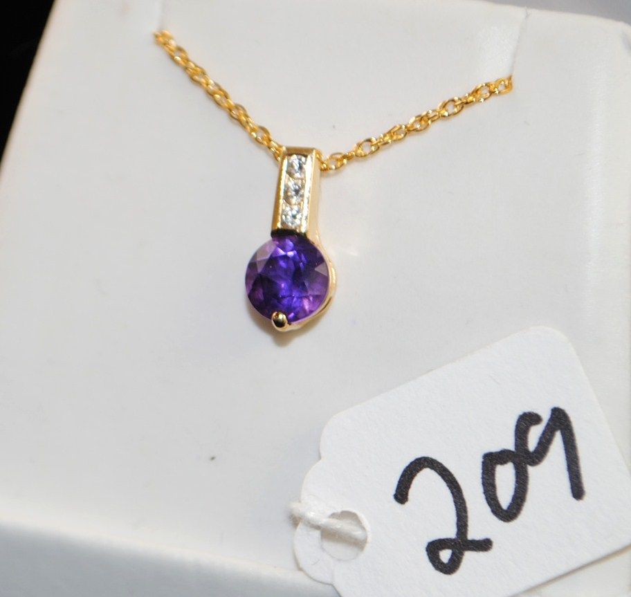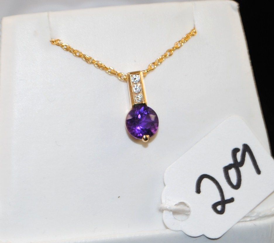 LADIES AMETHYST & DIAMOND PENDANT WITH ONE ROUND AMETHYST CENTER GEMSTONE AND THREE ROUND DIAMONDS SET IN 14K YELLOW GOLD PENDANT - APPRAISED RETAIL REPLACEMENT IS $1,100.00 - COMES WITH THE JEWELERS APPRAISAL CARD FOR INSURANCE
