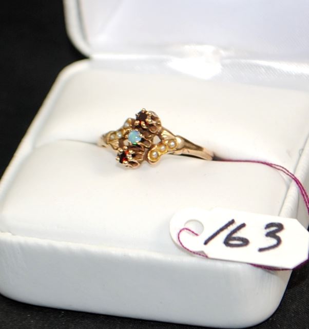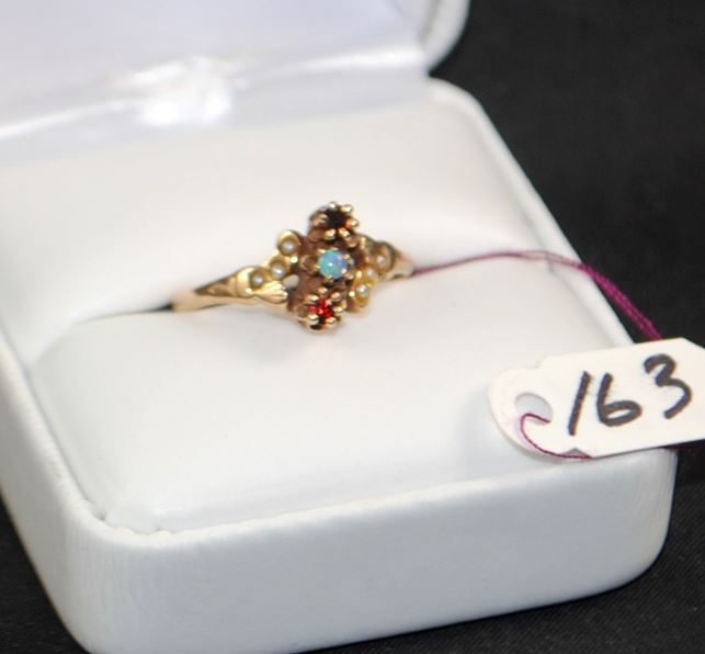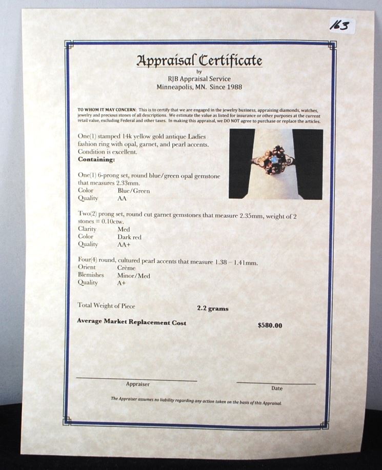 LADIES STAMPED 14K YELLOW GOLD ANTIQUE LADIES FASHION RING WITH 6-PRONG SET, ROUND BLUE/GREEN OPAL GEMSTONES, BLUE/GREEN COLOR, AA QUALITY. TWO PRONG SET, ROUND CUT GARNET GEMSTONES THAT WEIGH 0.10CTW, MED CLARITY,